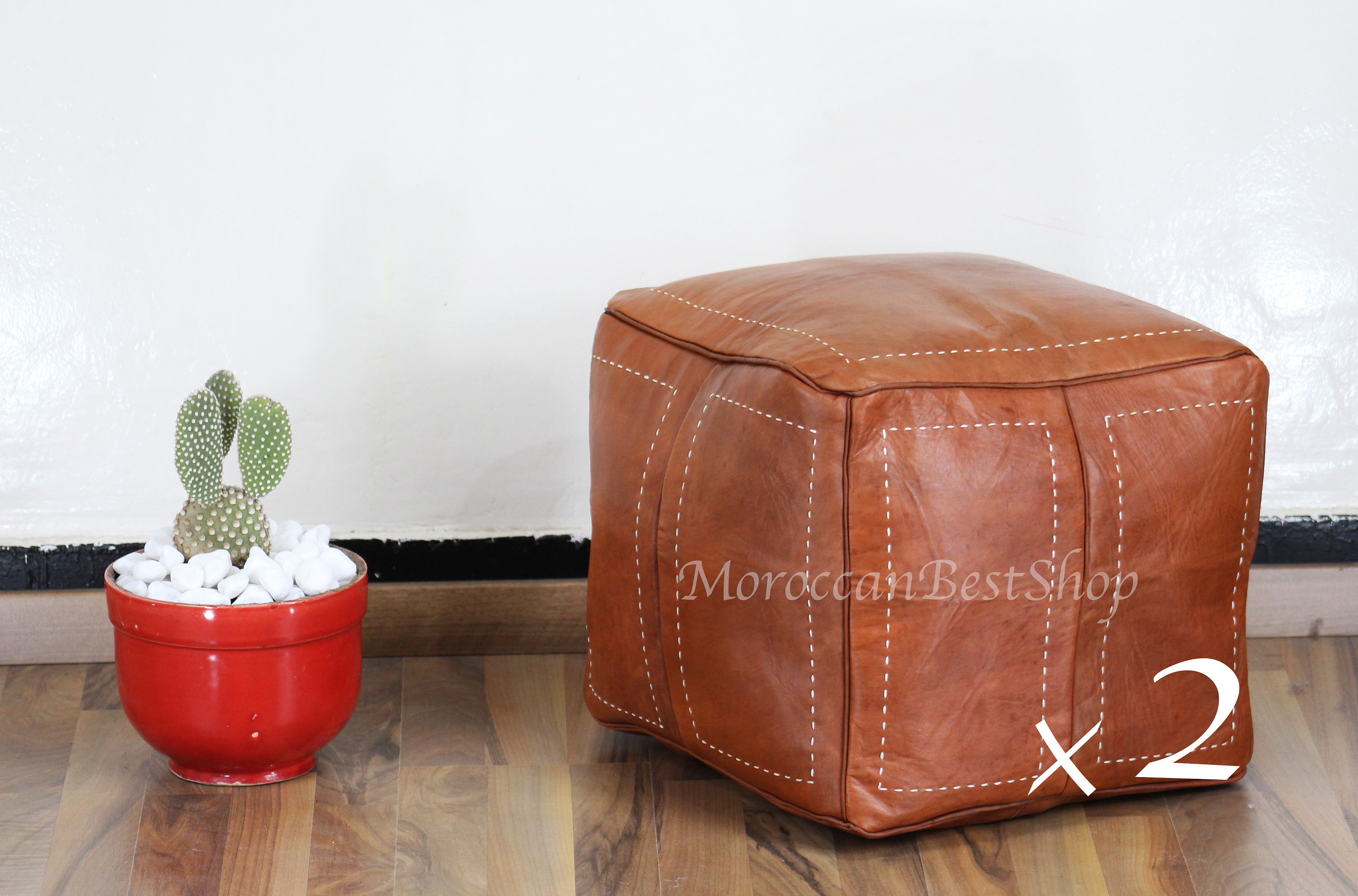 Set of 2 Moroccan Leather Poufs - Handmade Tan Brown Square Ottoman...