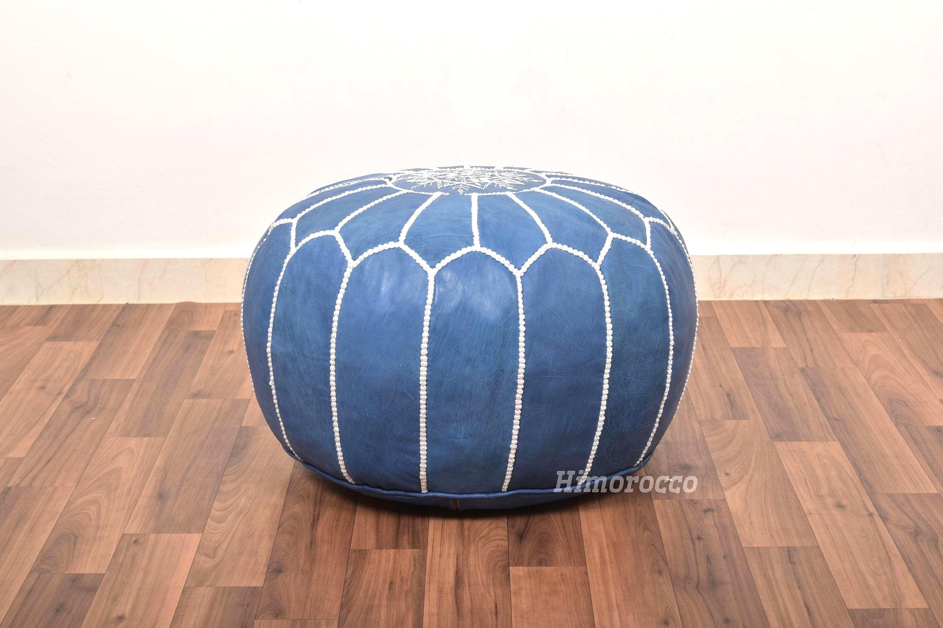 Stuffed Blue jeans leather pouf with top embroidery, blue moroccan ...