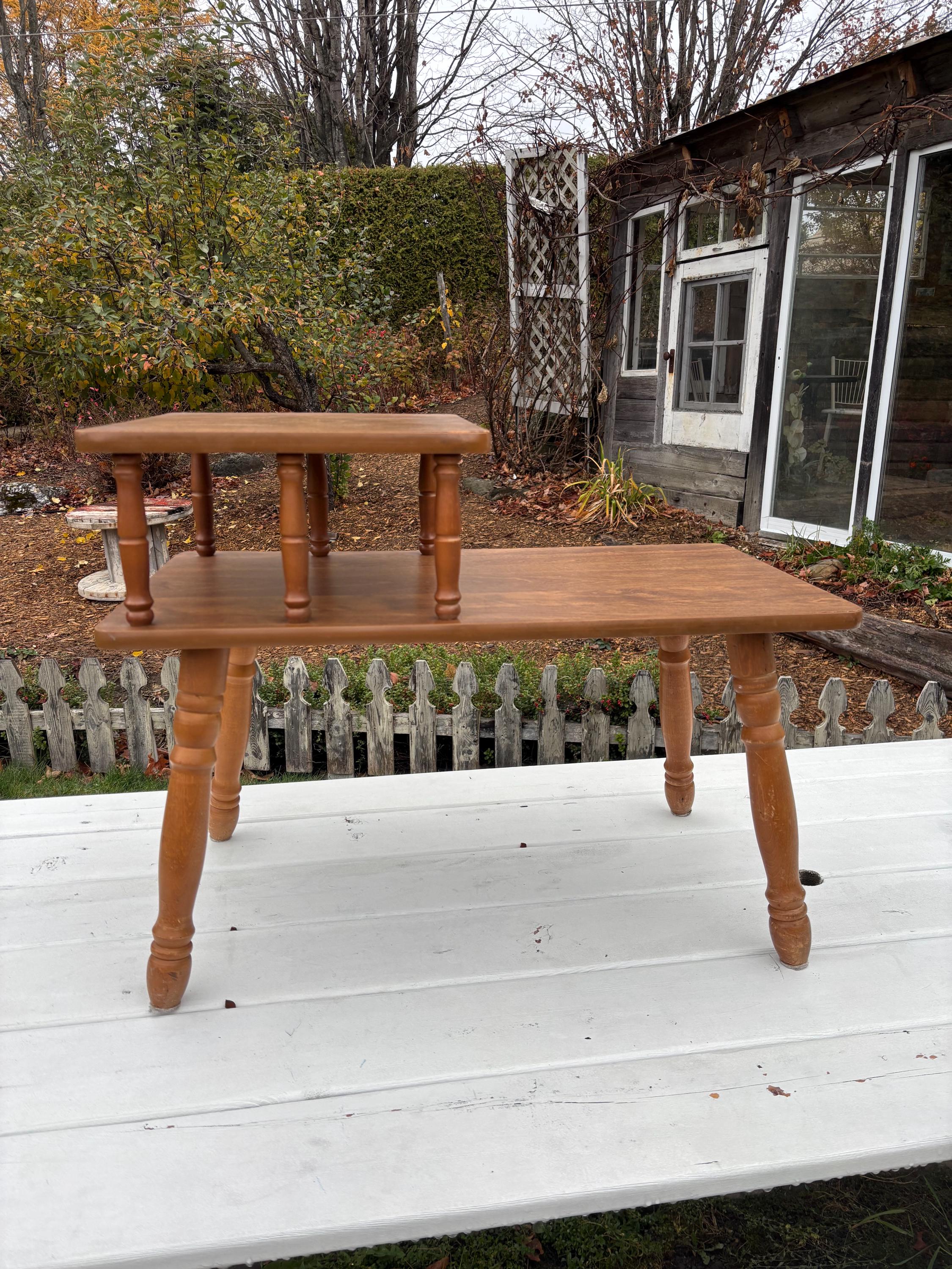 Vintage 70s modern 2 tier formica table with wooden legs.