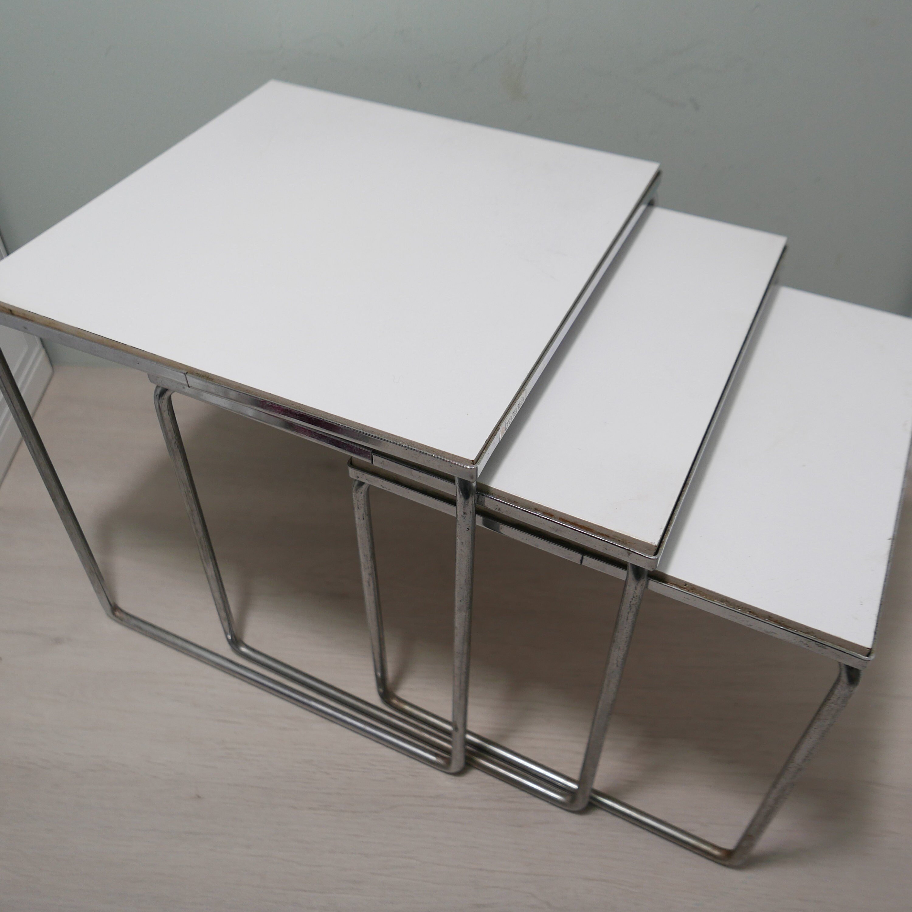 "Super Retro Mid Century Nest Of Three Formica Topped Tables With Dansette Legs. A lovely littl...