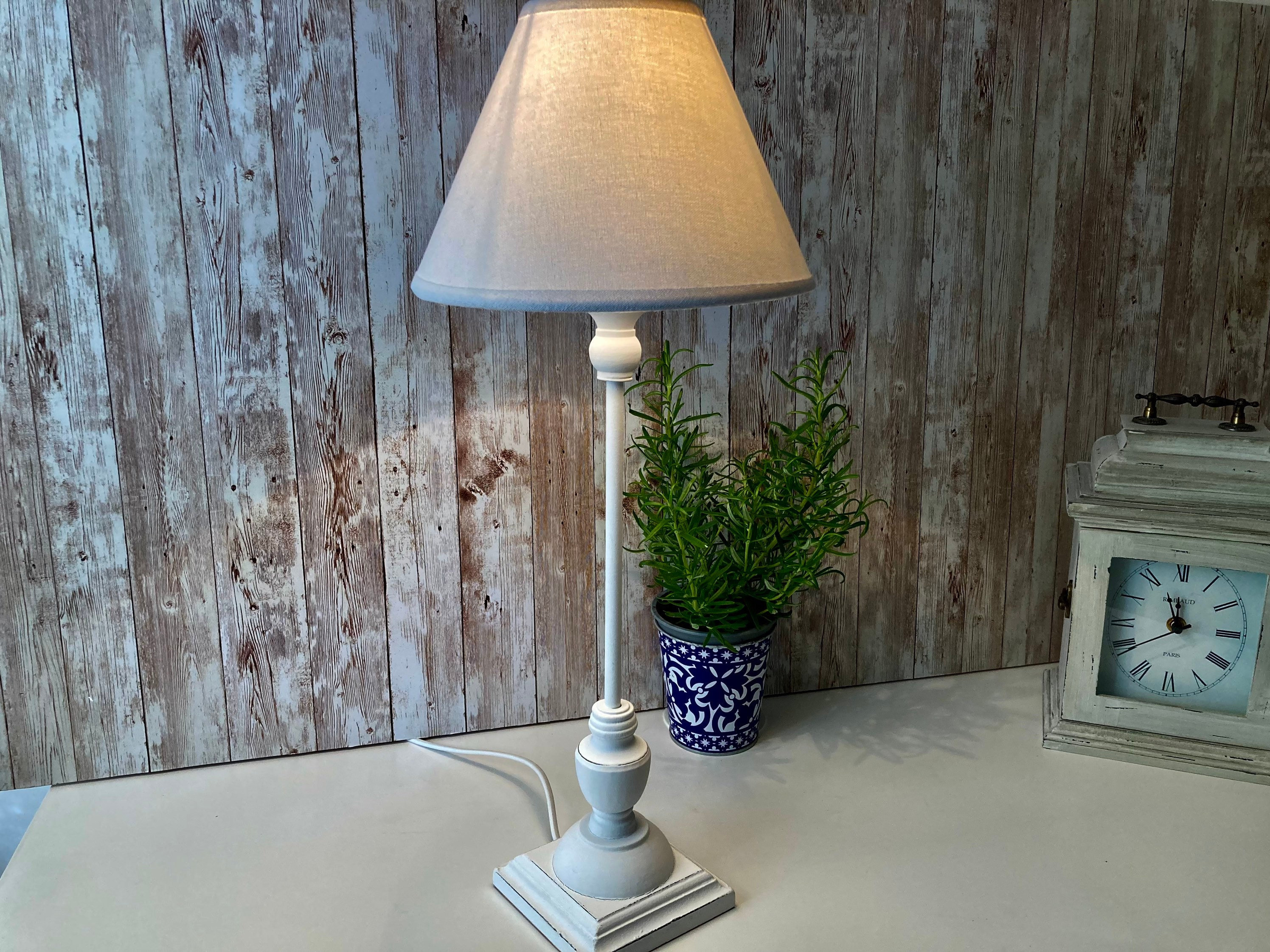 This is a stylish shabby chic style table lamp for the home. It features a white distressed wooden l...