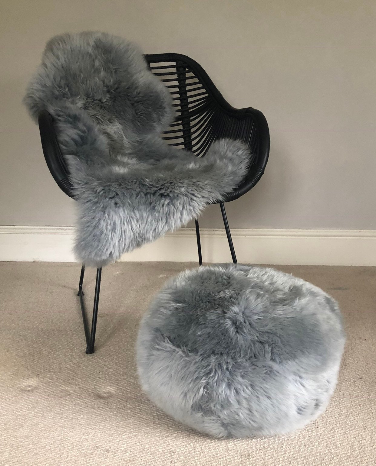 Grey sheepskin pouffe, silver grey sheepskin, grey furry footstool,...