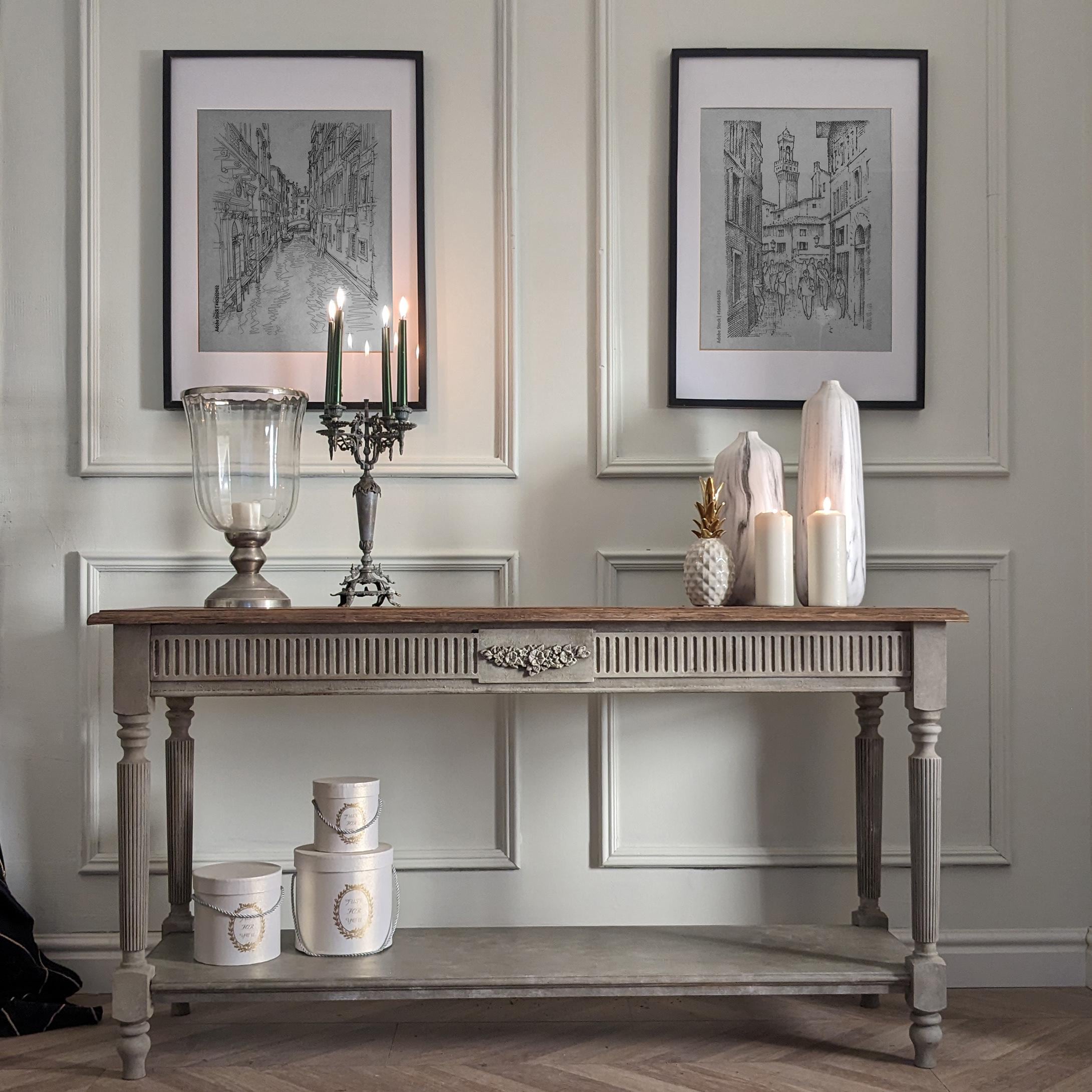 "Side table with a lower shelf, finished in a beautiful gray-beige tone. The carefully hand-app...