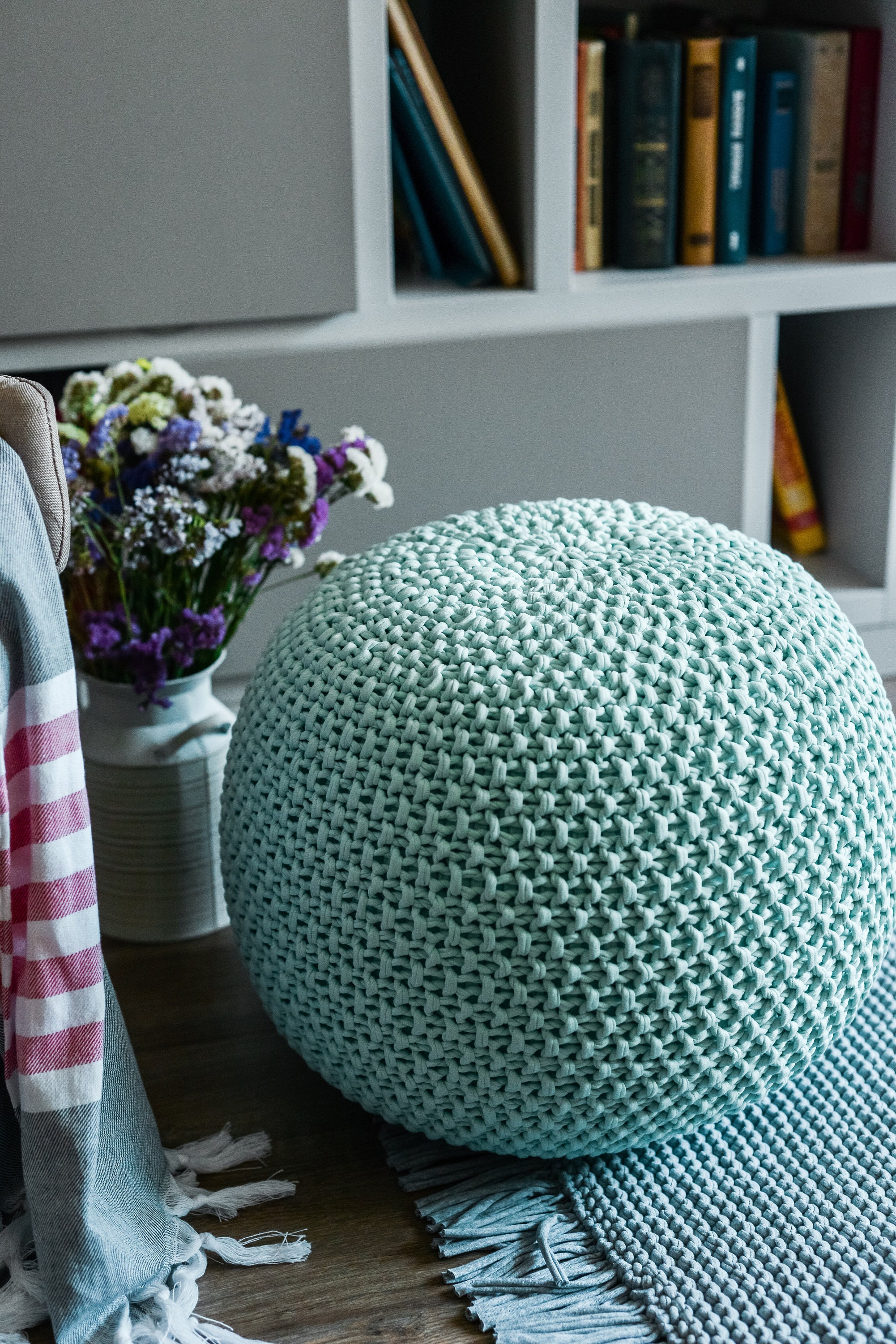 Light green knit pouf, Handmade pouf, Crochet round footstool, Knit...