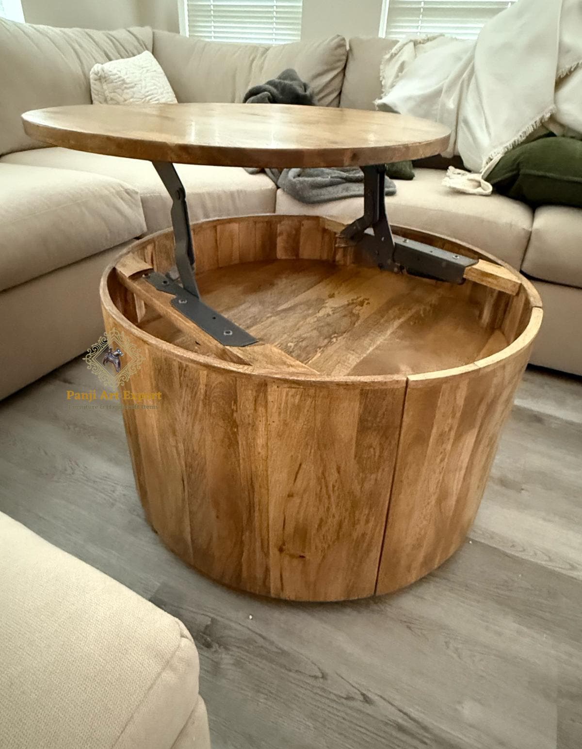 Handmade Round Wooden Lift Top Coffee Table: Hidden Storage