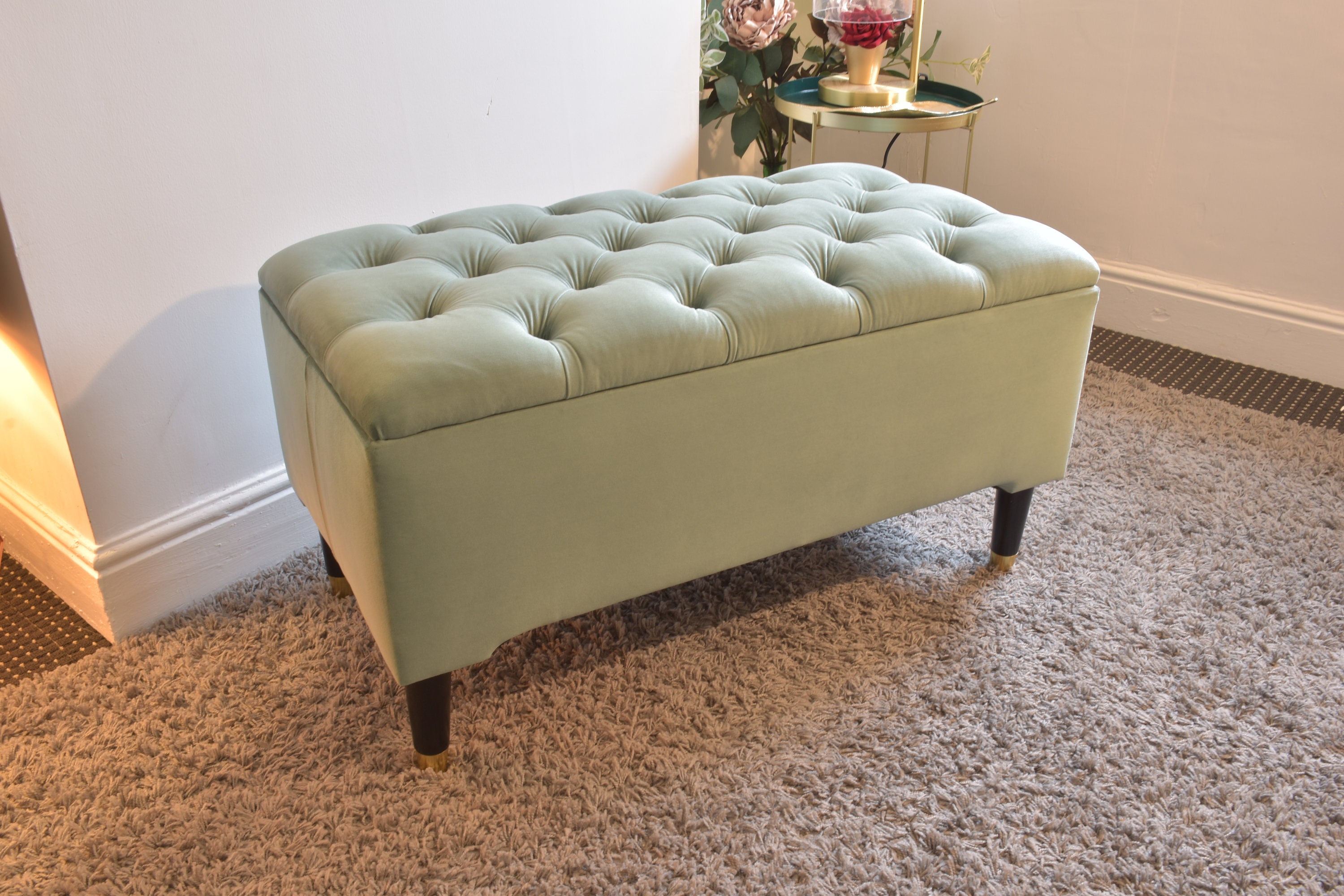 Add a touch of sophistication to your home with this beautiful pale green tufted storage ottoman. Th...