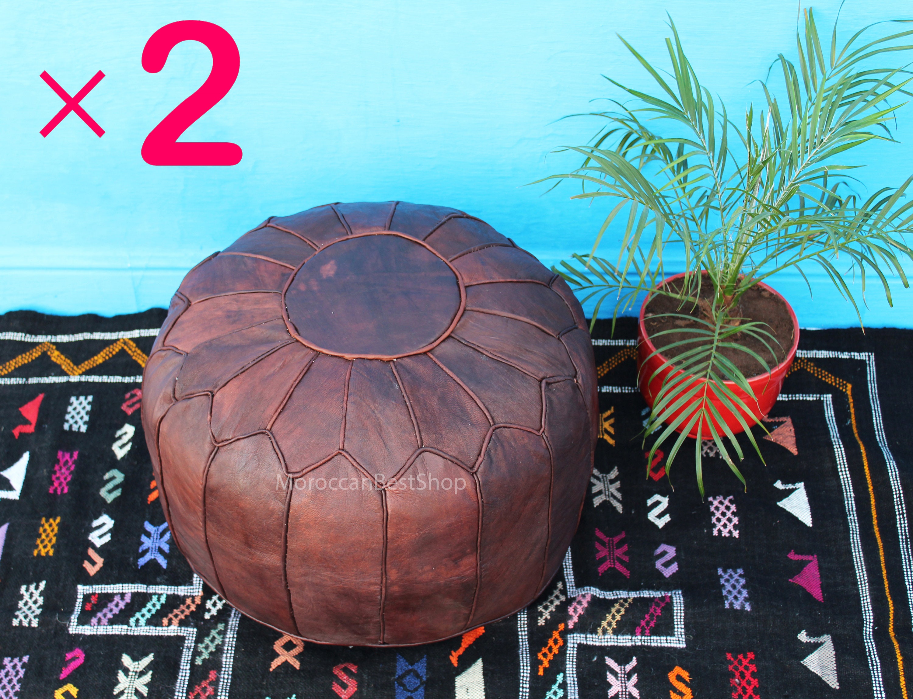 Description: Elevate your home with this beautiful set of two handmade Moroccan leather poufs in a r...