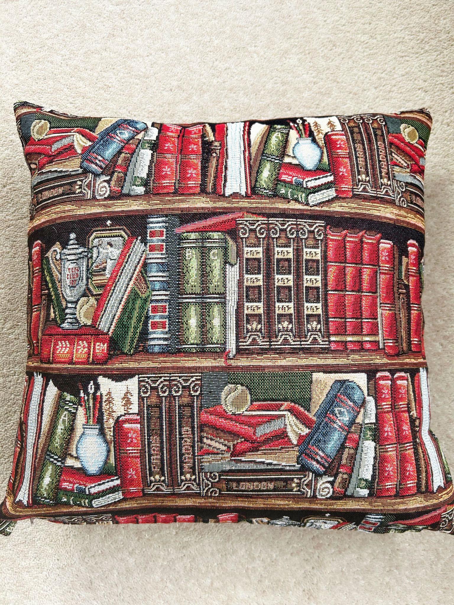 "This cushion cover is handmade from luxury tapestry woven material in library design with over...