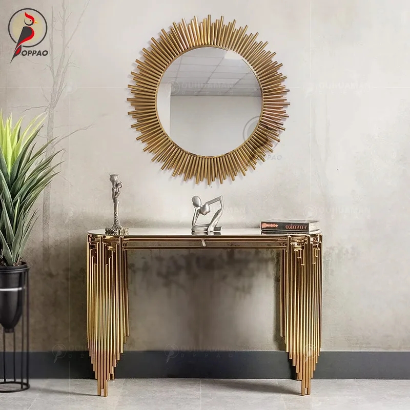 Indoor furniture titanium gold entrance table Tempered glass Hotel living room Marble sun mirror ent...