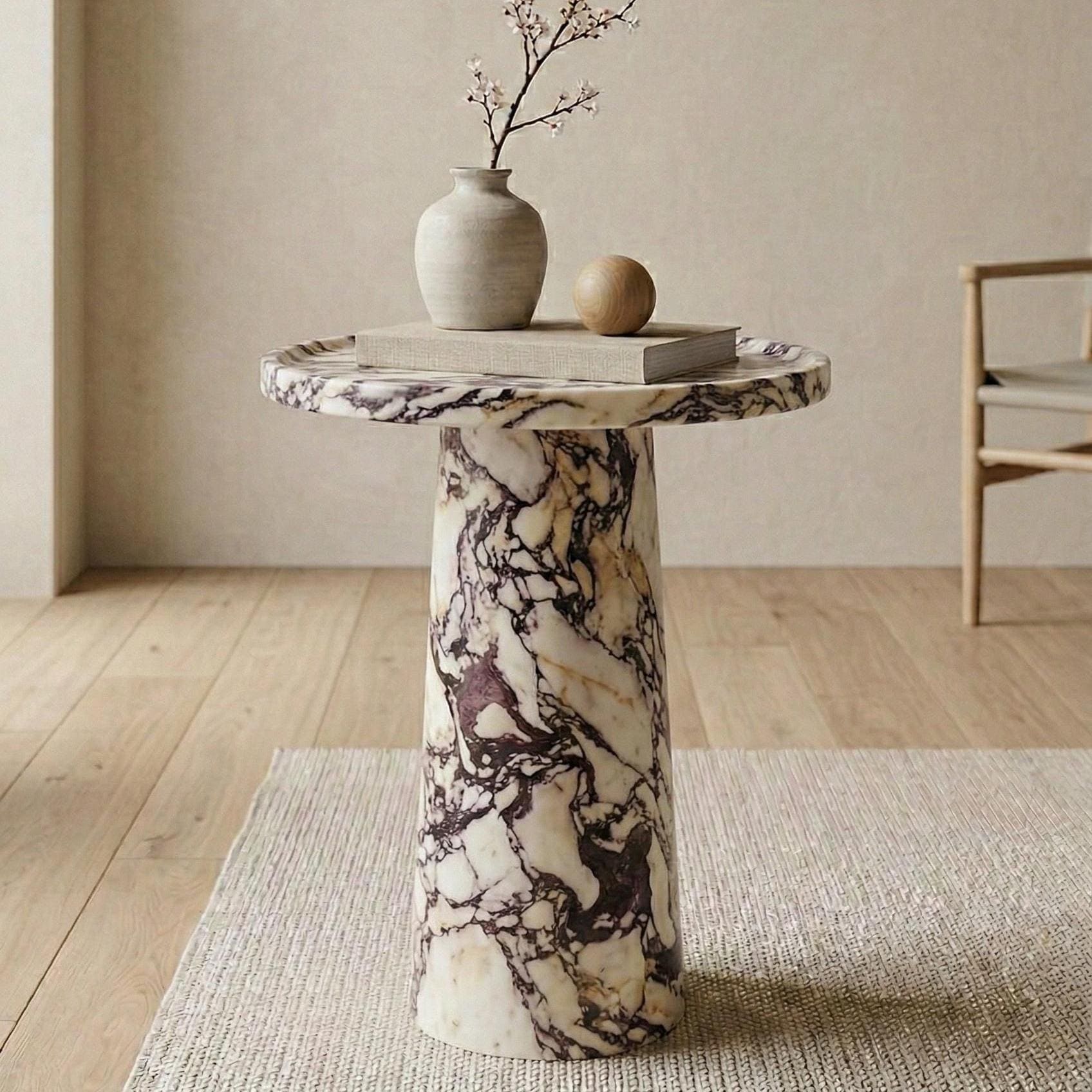 "Bring sculptural elegance into your home with this Calacatta Viola Marble Plinth Table, a luxu...