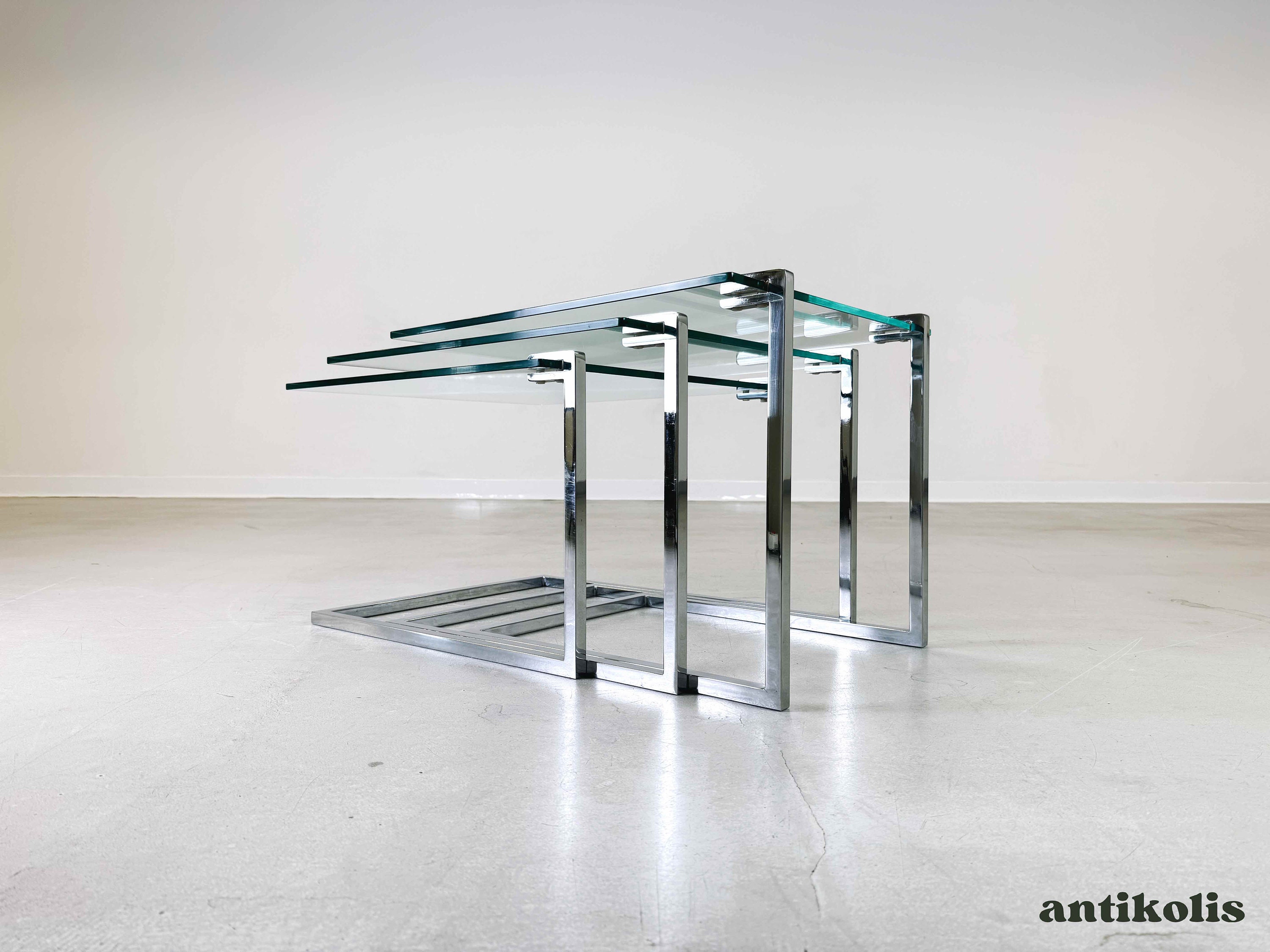 We are offering three beautiful mid-century glass nesting tables from the Design Institute America (...