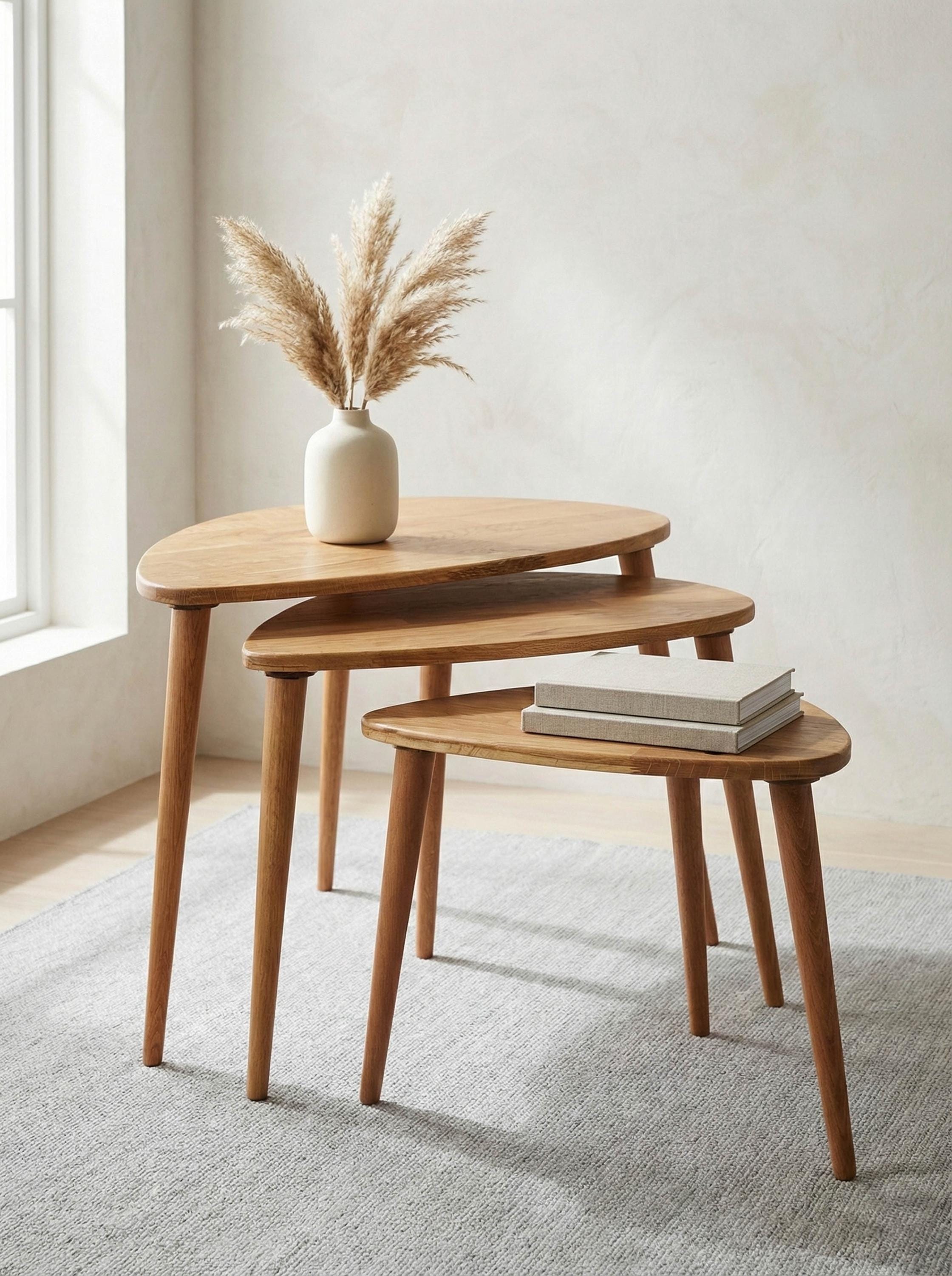 "Elevate your home with the timeless elegance of these solid oak nesting tables, designed in a ...