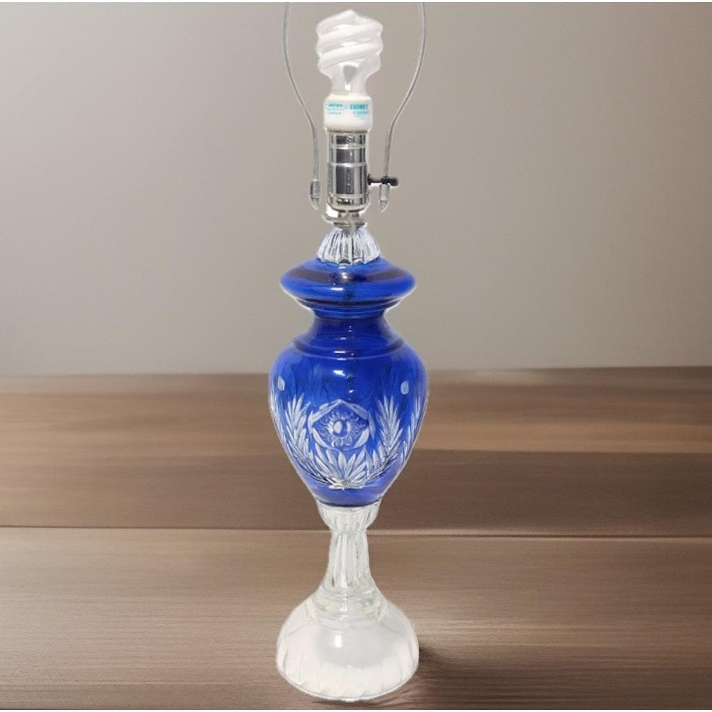 The Vintage Cobalt Blue Cut To Clear Bohemian Czech Cut Glass Table Lamp is a stunning piece that sh...