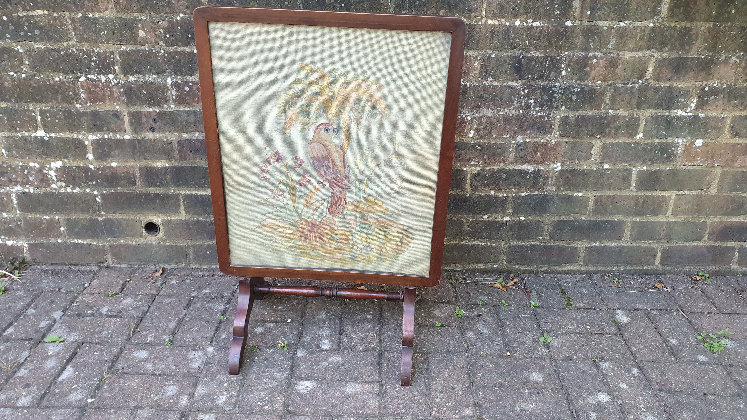 Large Impressive Tapestry Fire Screen Parrot Motif Mahogany Folds Up to Form Coffee Table Stylish ta...