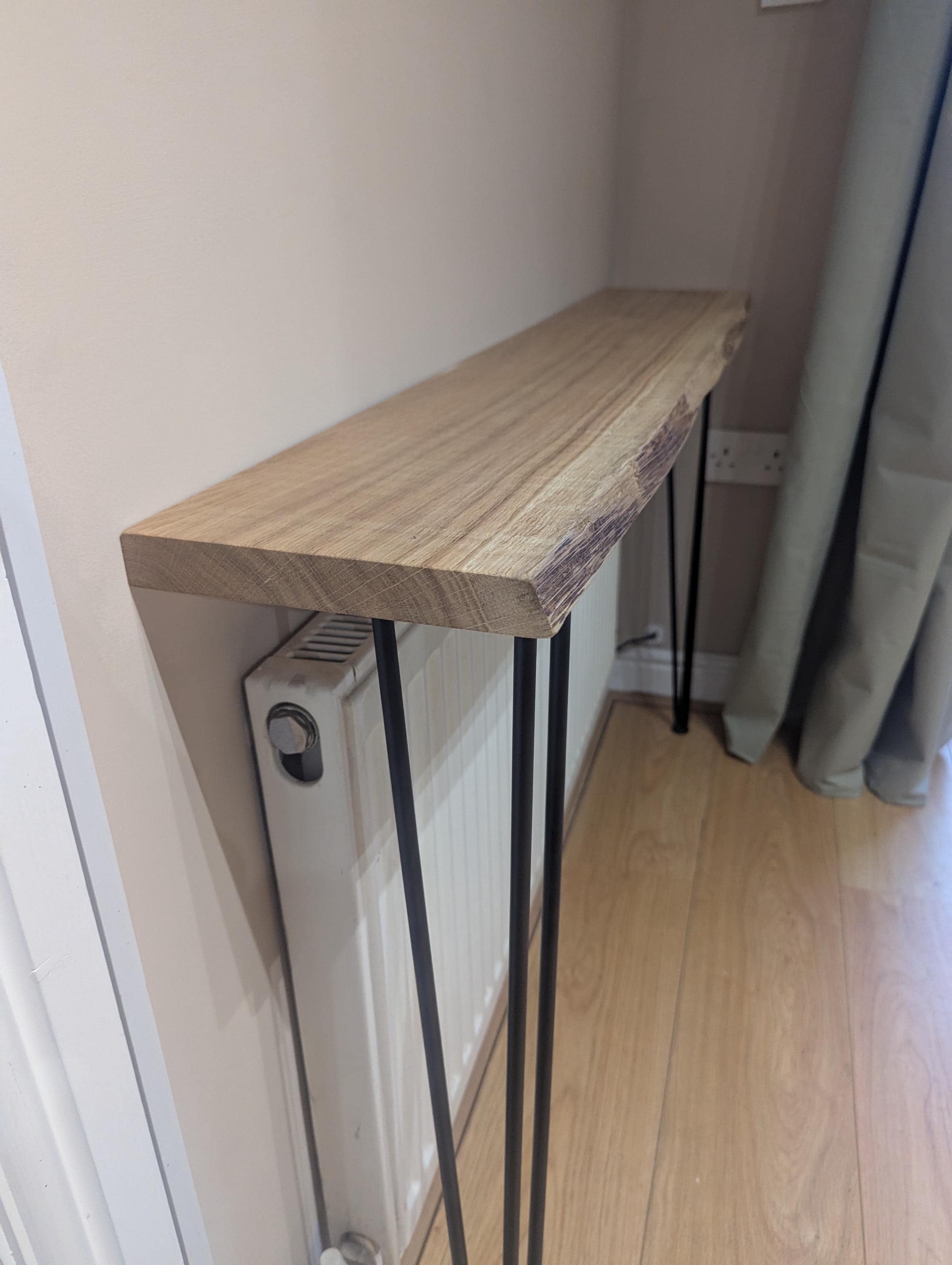 live edge solid oak console table with hairpin legs- rustic hallway...