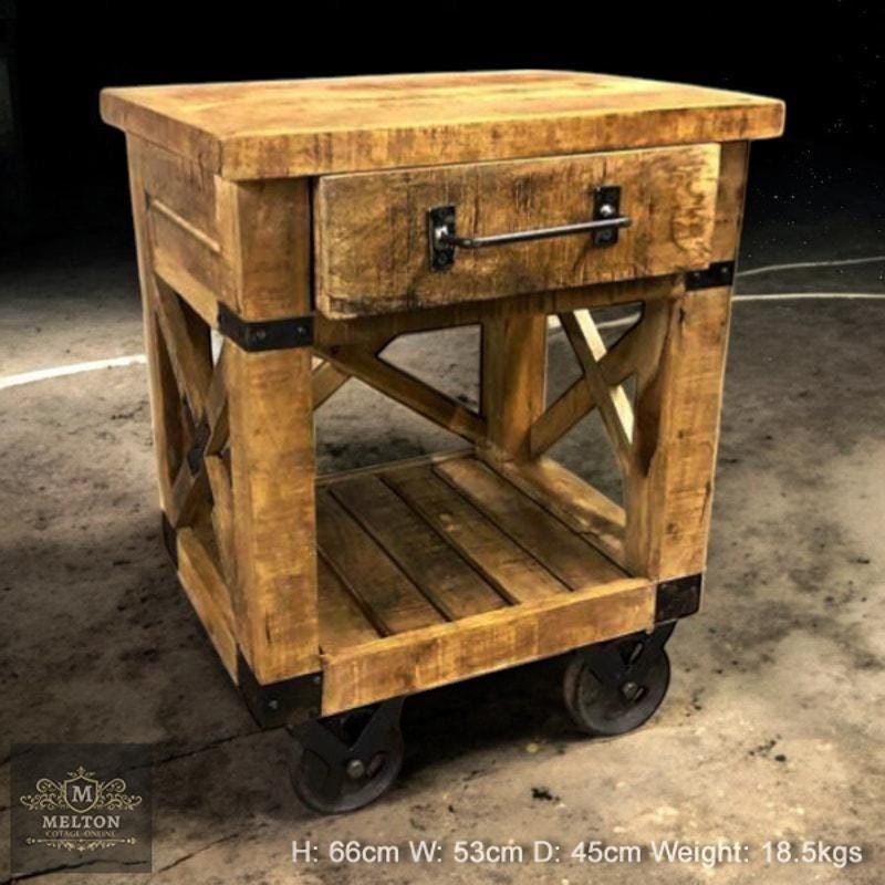 Industrial Style Side Table & Draw with Chunky Cast Iron Wheels...