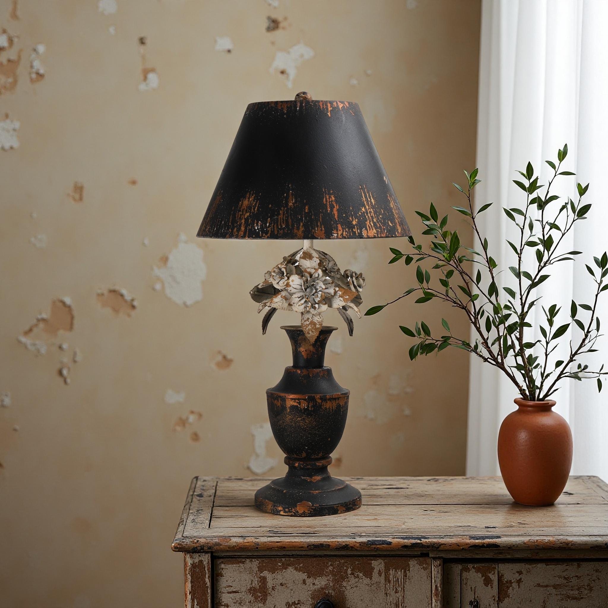 Vintage Floral Table Lamp: Distressed Black Iron, Rustic Cottage De...
