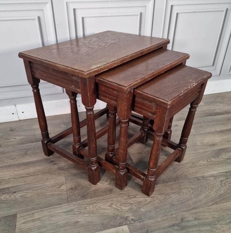 Vintage Nest Of Tables - Wooden Oak Turned Legs - Rustic Occasional Side Nesting Description A vinta...