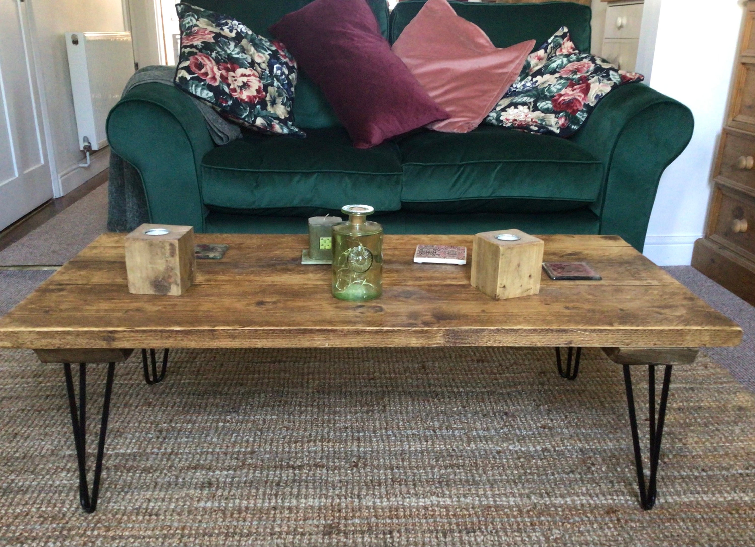 Reclaimed timber coffee table with hairpin legs