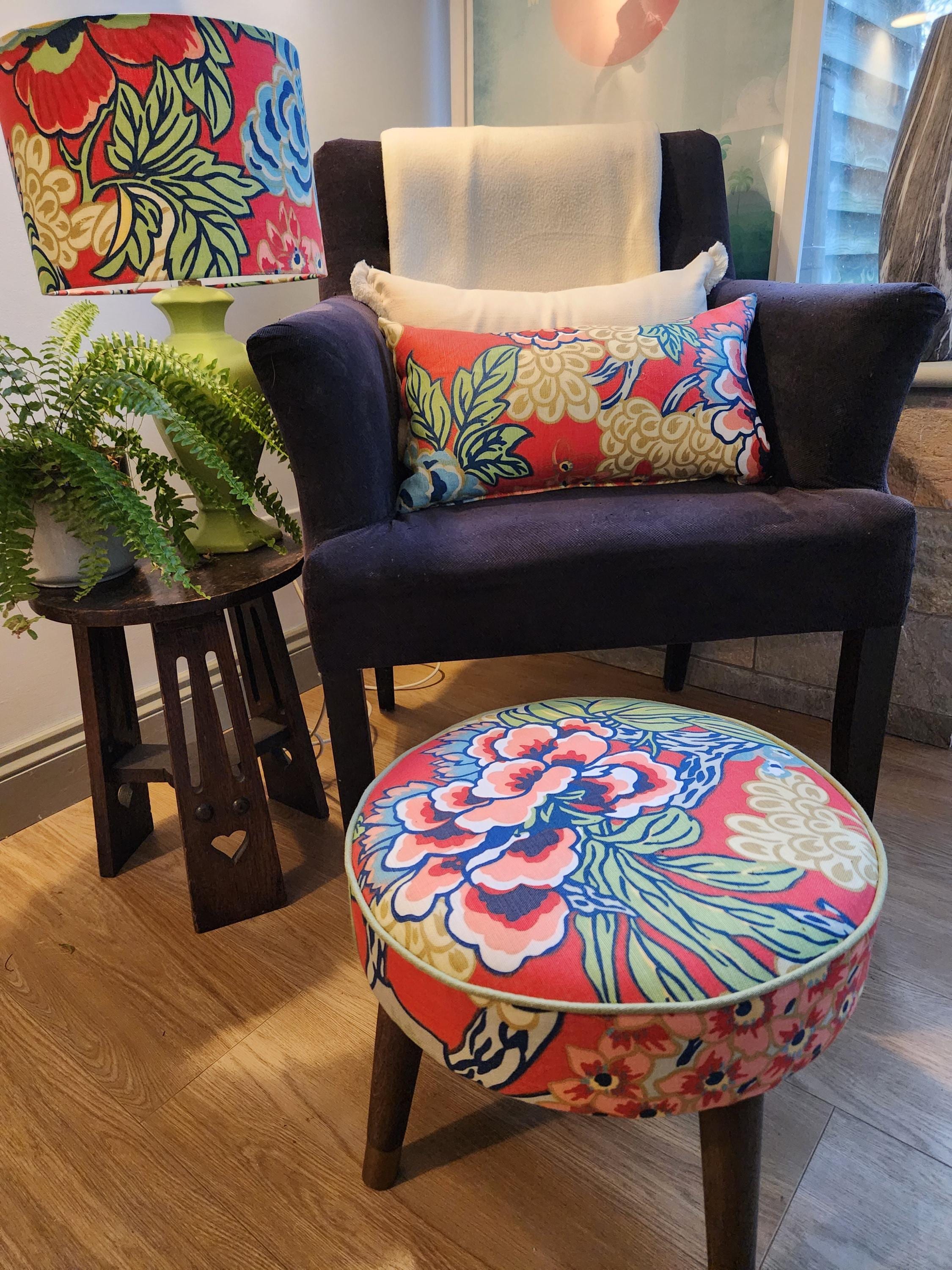 A beautiful handcrafted small round footstool in Honshu fabric by Thibaut with premium angled legs w...