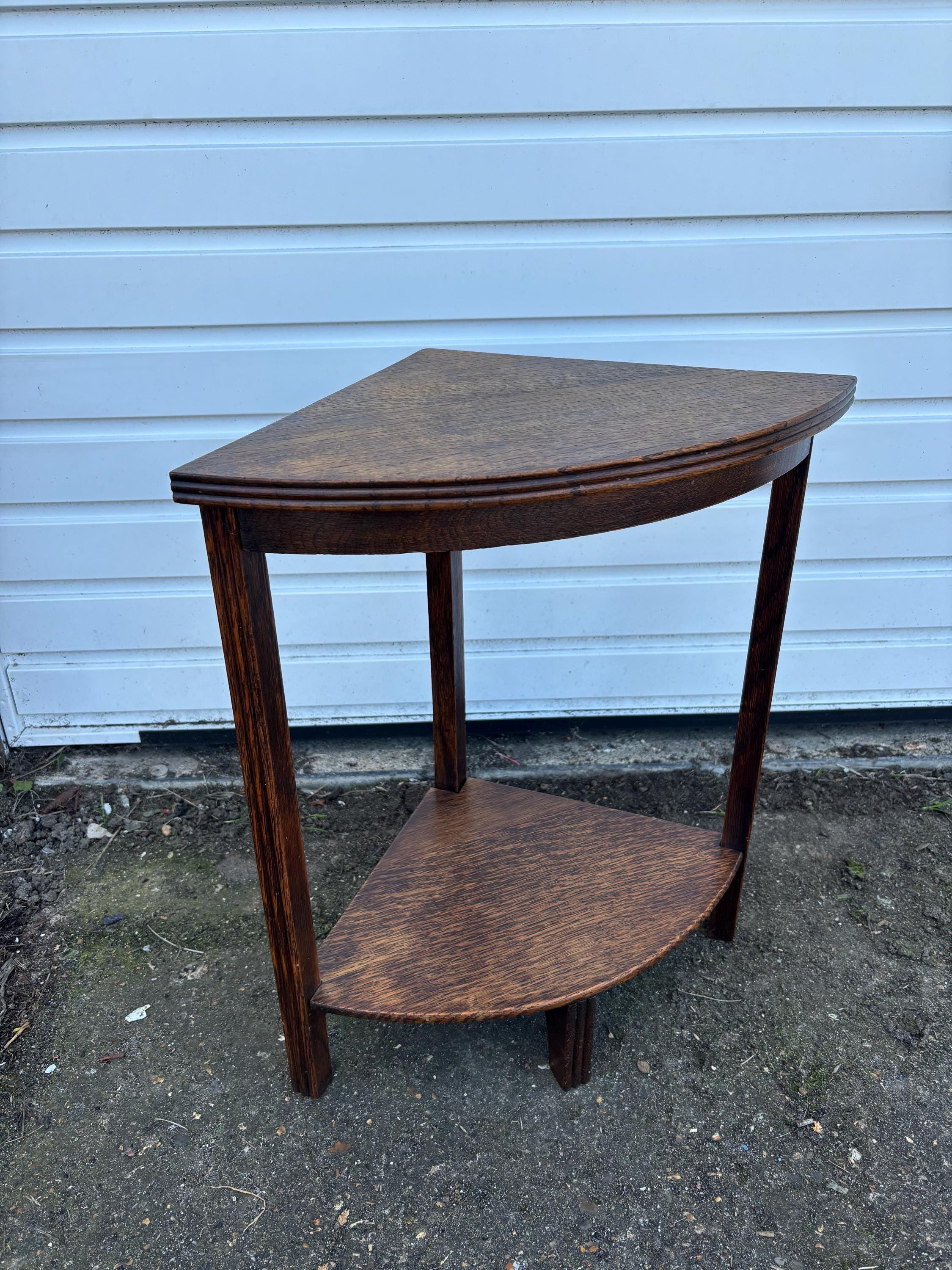 Description Beautiful antique oak corner table featuring a two-tier design with a triangular top and...