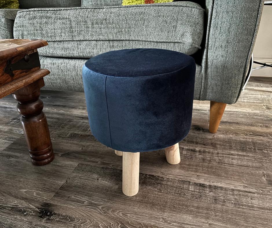 Navy Velvet Footstool | Small Round Footstool With 3 Wooden Legs