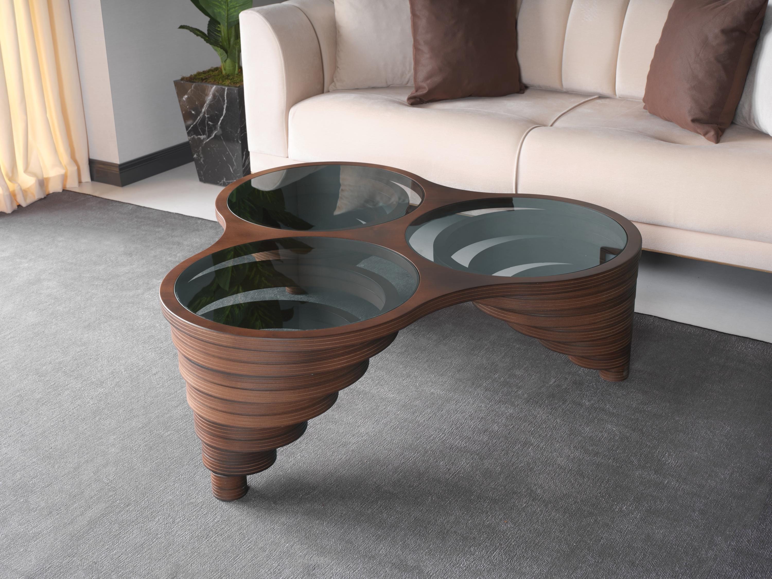 Natural Walnut Coffee Table: Smoked Glass Top, Modern Living Room