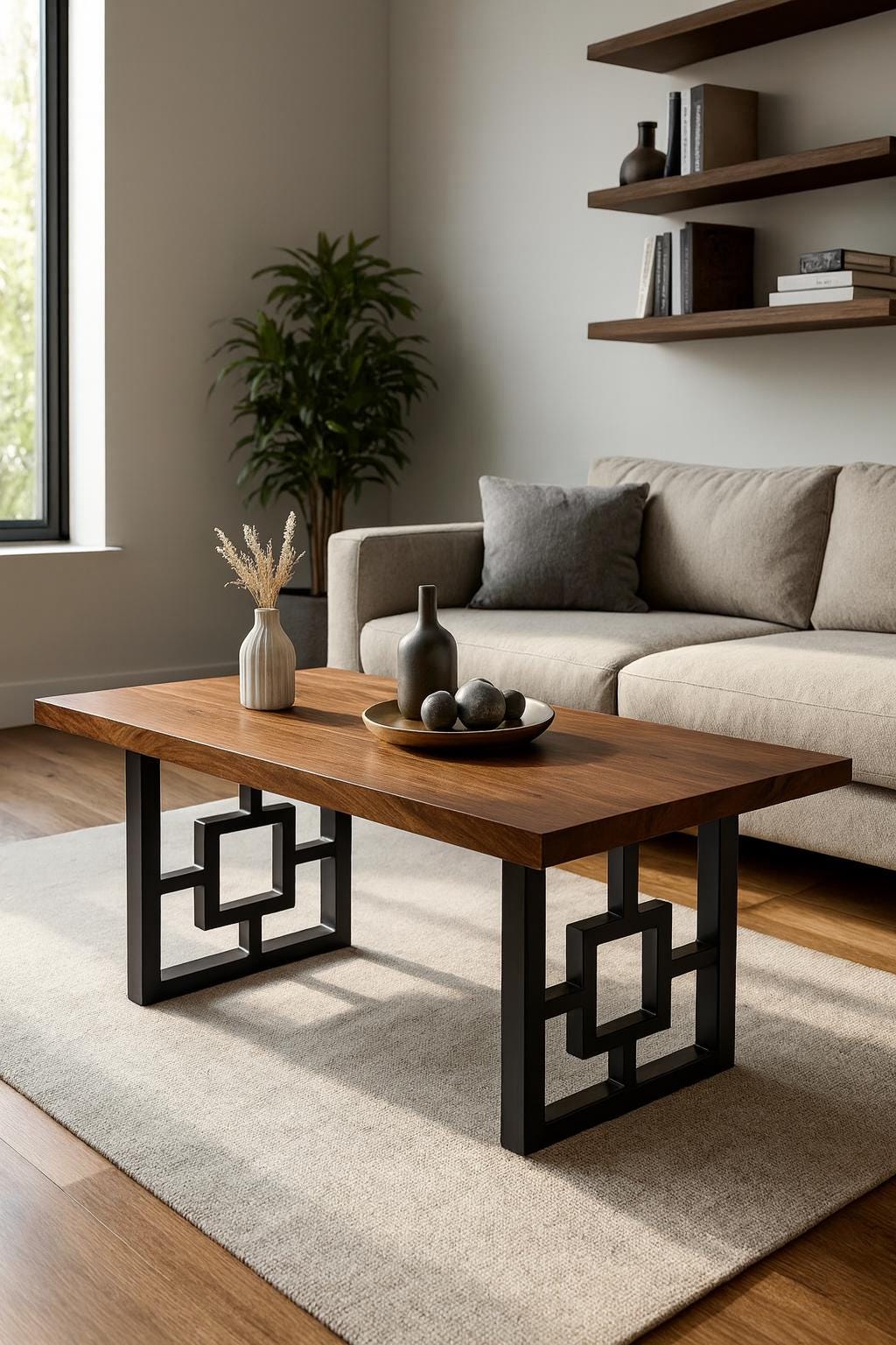 "Handcrafted modern-industrial coffee table built with a solid hardwood top and a matte black w...