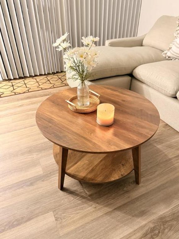 Round Wooden Coffee Table with Storage Shelf - Modern Mid Century L...