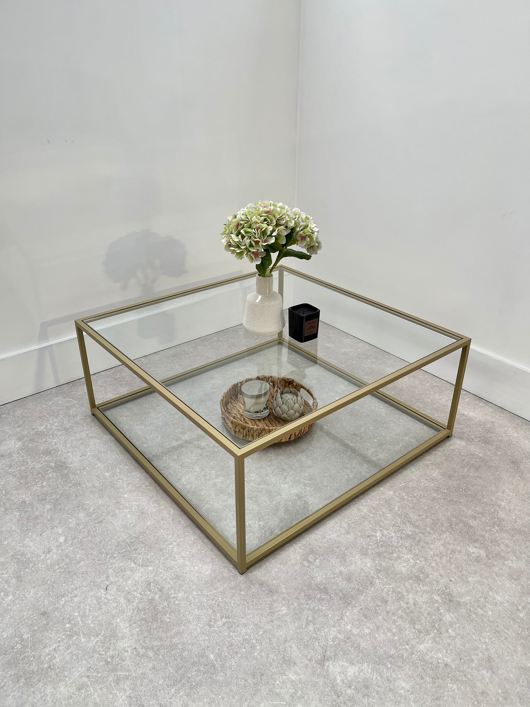 Mila Square Glass Metal Coffee Table With Shelf - Gold