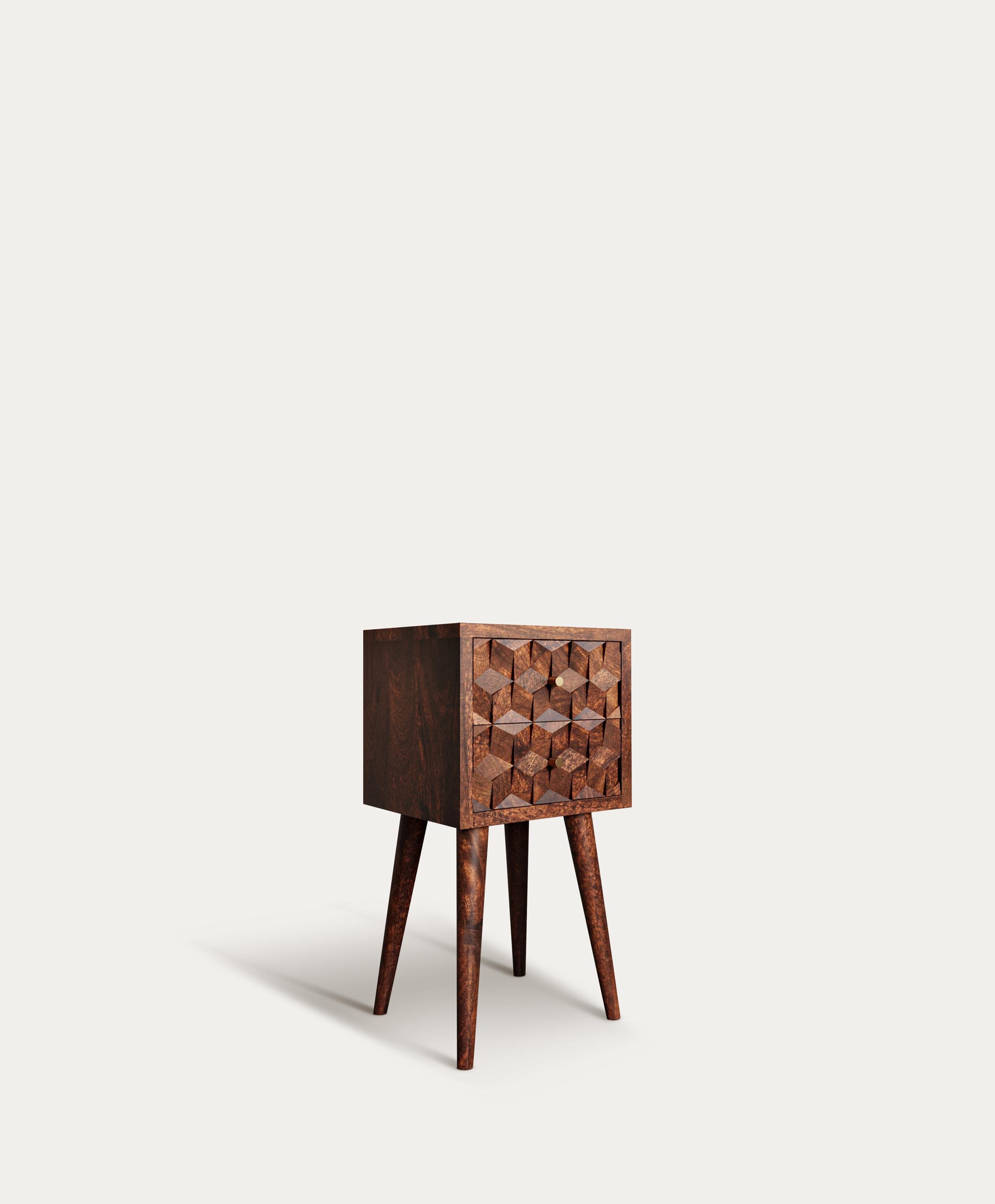 Elevate your space with our hand-carved high bedside table, handmade from solid mango wood. Standing...