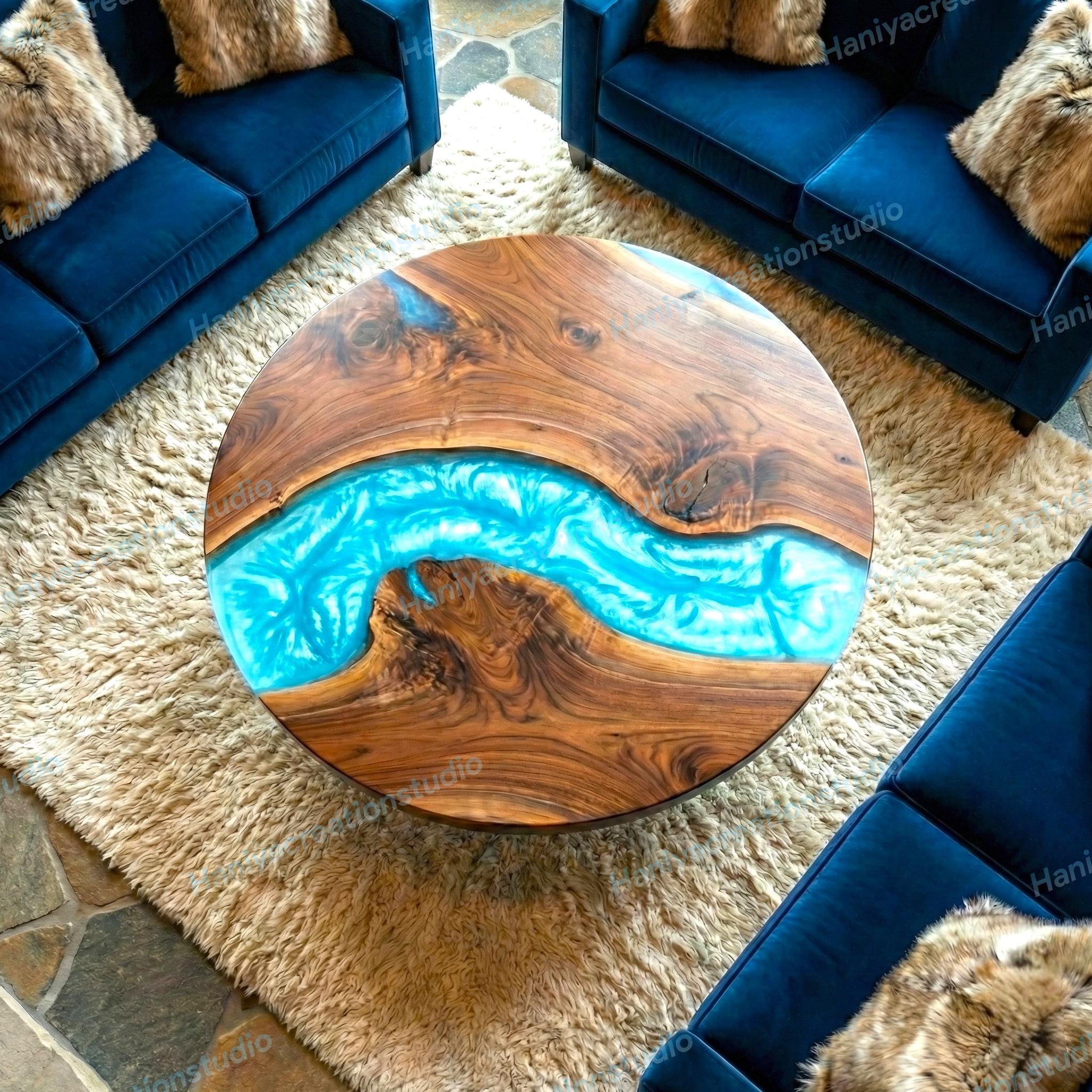 Metallic Teal Resin & Walnut Wood Round Coffee Table - Custom M...