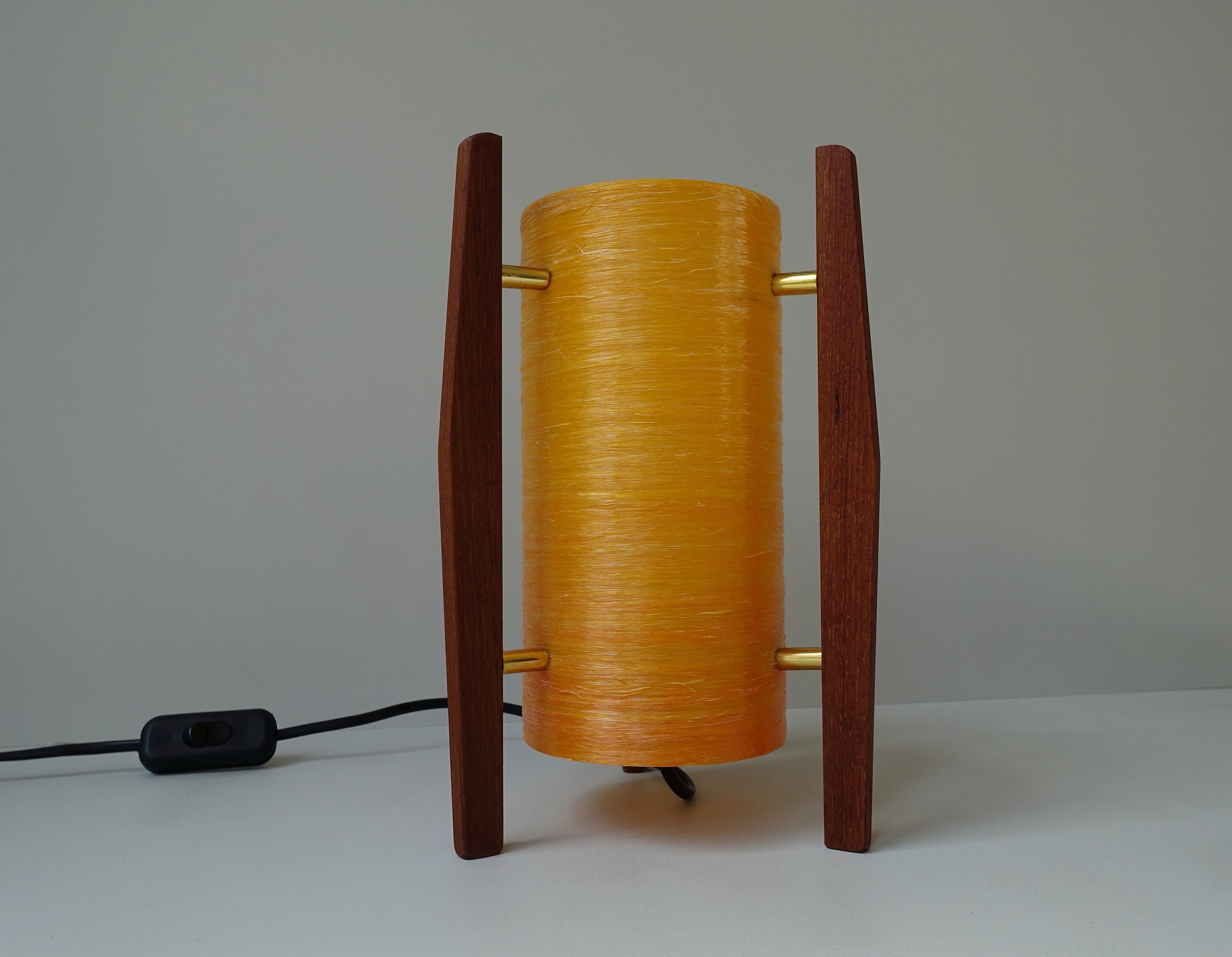 Very rare small rocket table lamp 1960s teak fiberglass ochre brass...