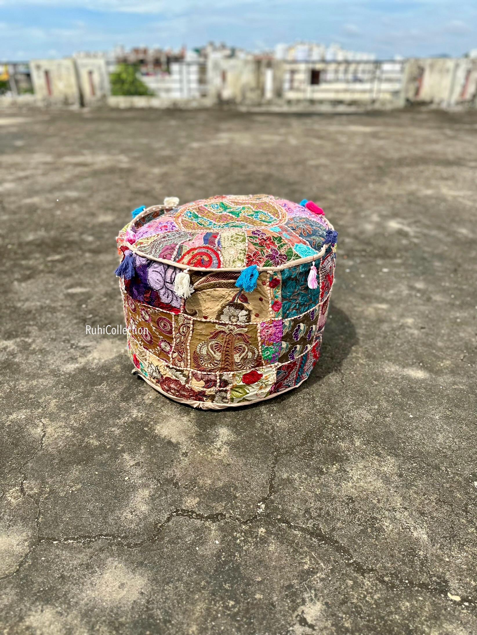 "**Indian Bohemian Ottoman Pouf - Ethnic Patchwork, Embroidered Bean Bag, Boho Footstool, Vinta...