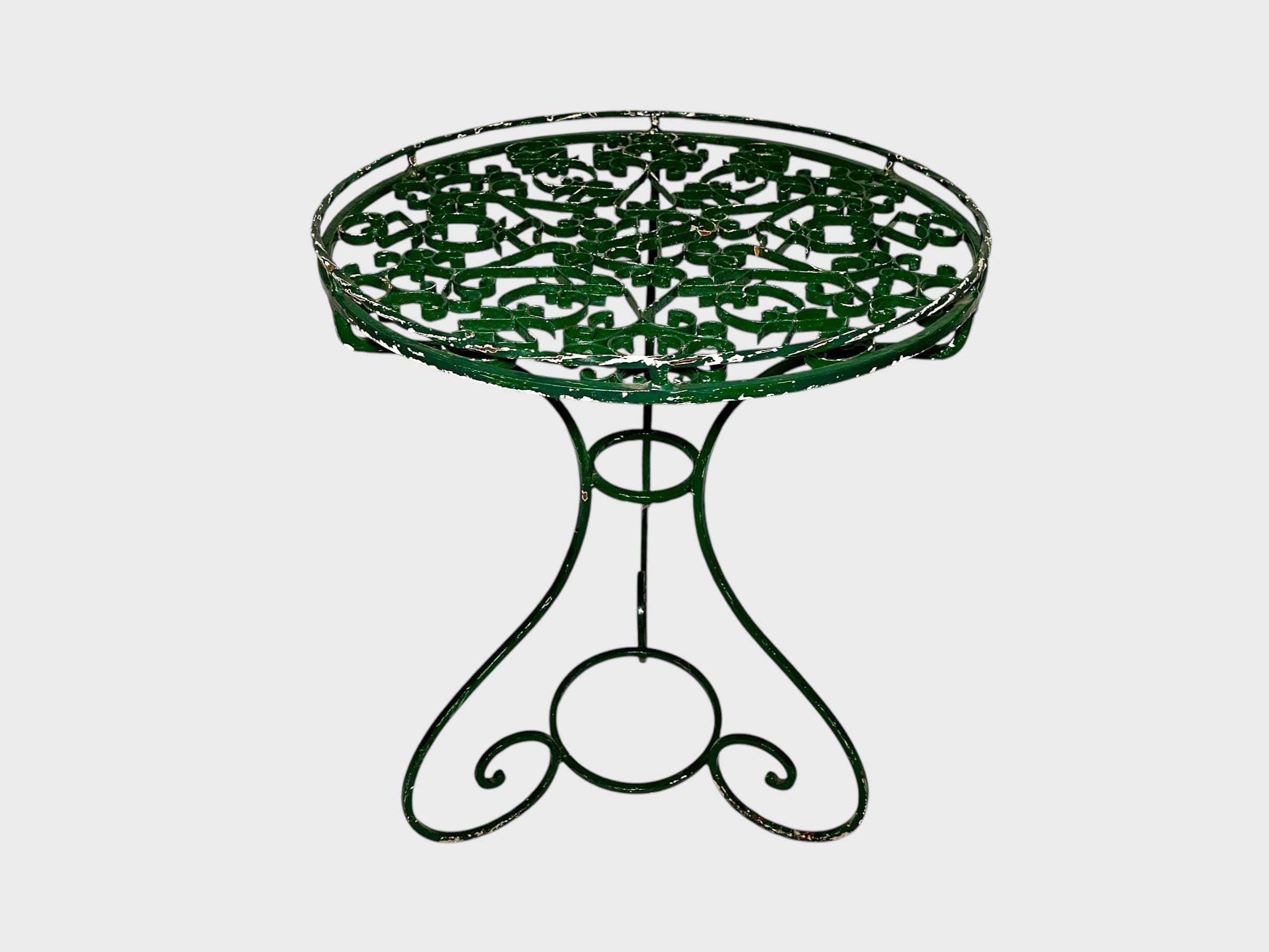 "Stunning vintage round side table features richly twirled green and white painted wrought iron...