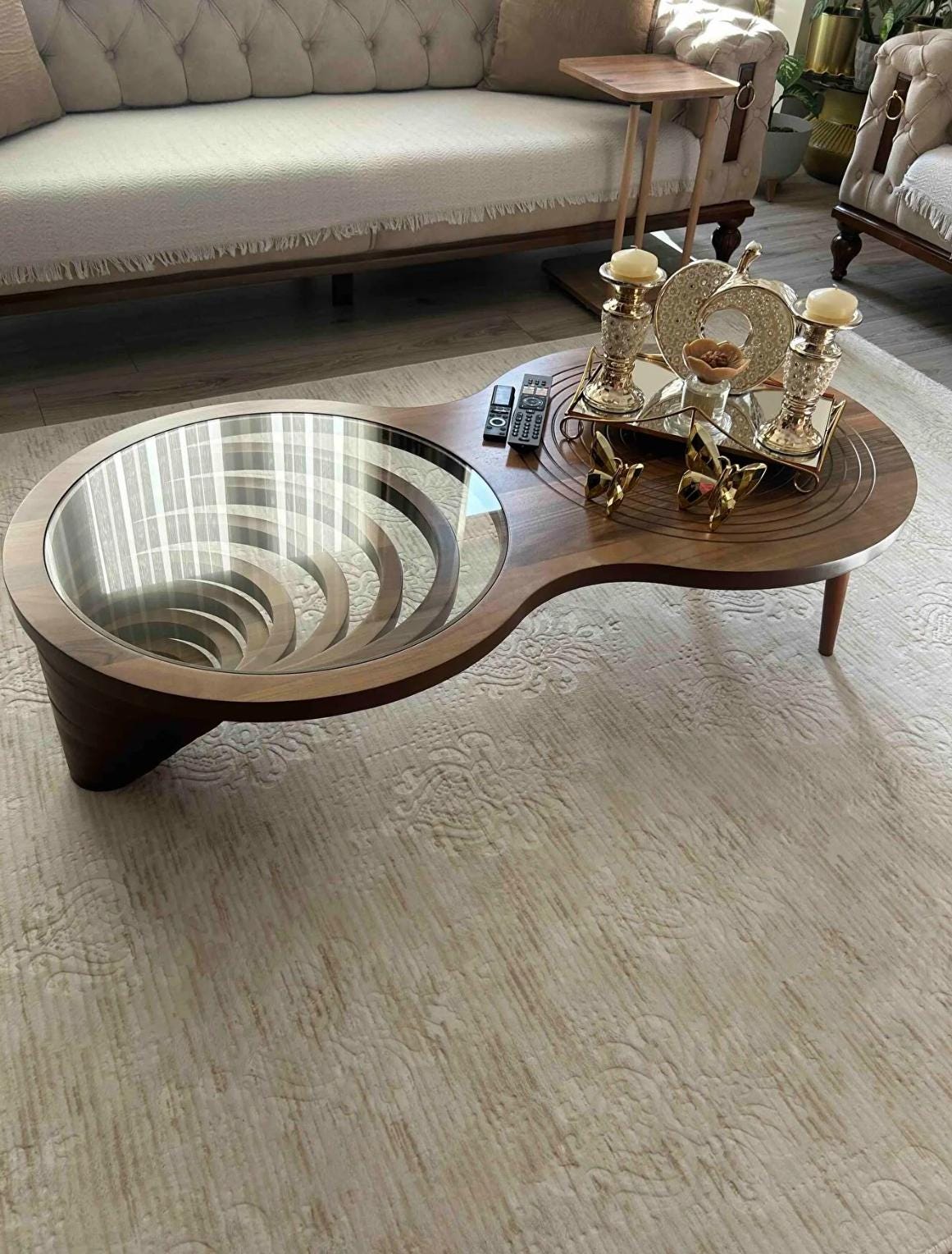 3D Depth Effect Coffee Table: Walnut Wood & Tempered Glass