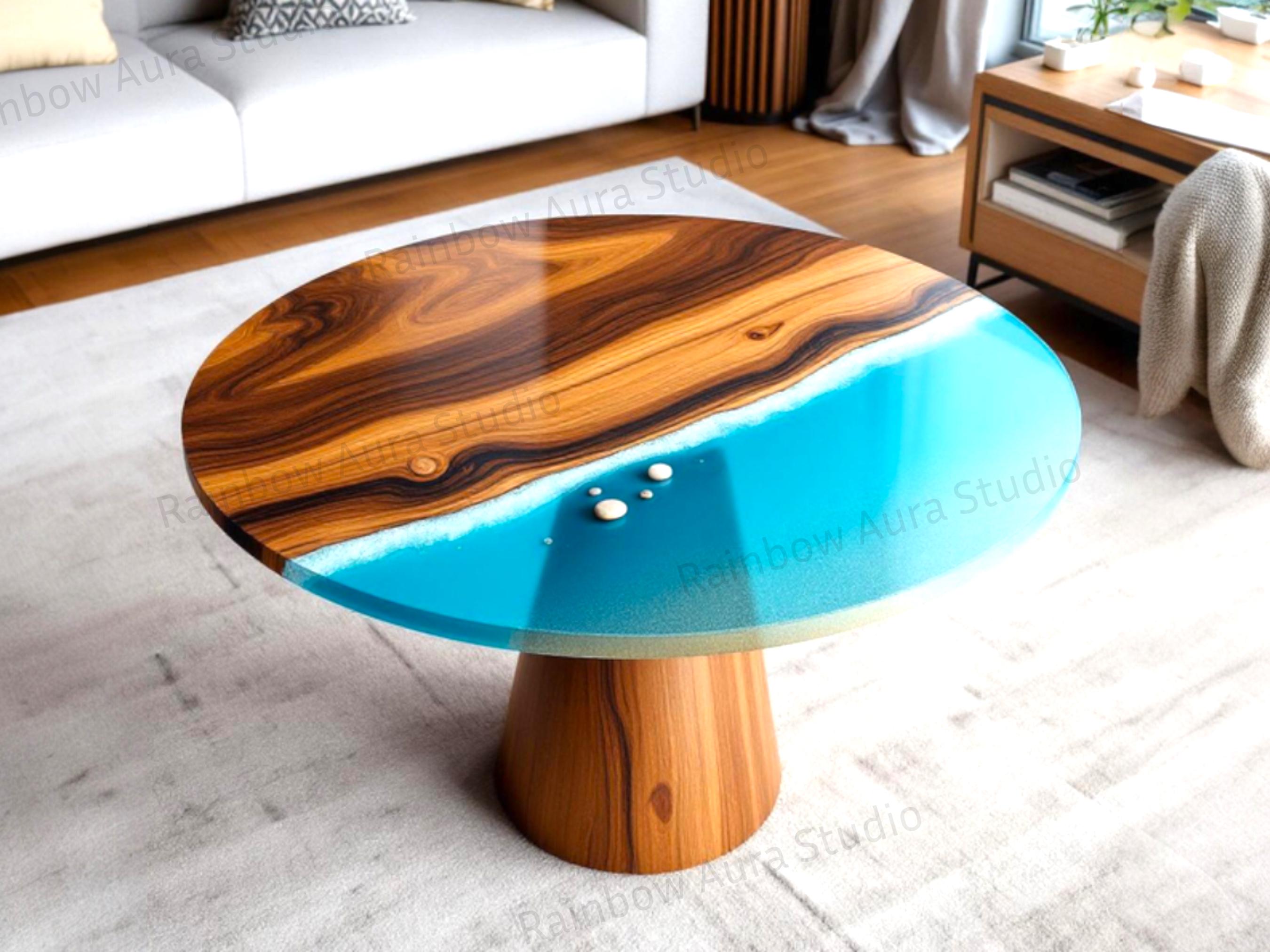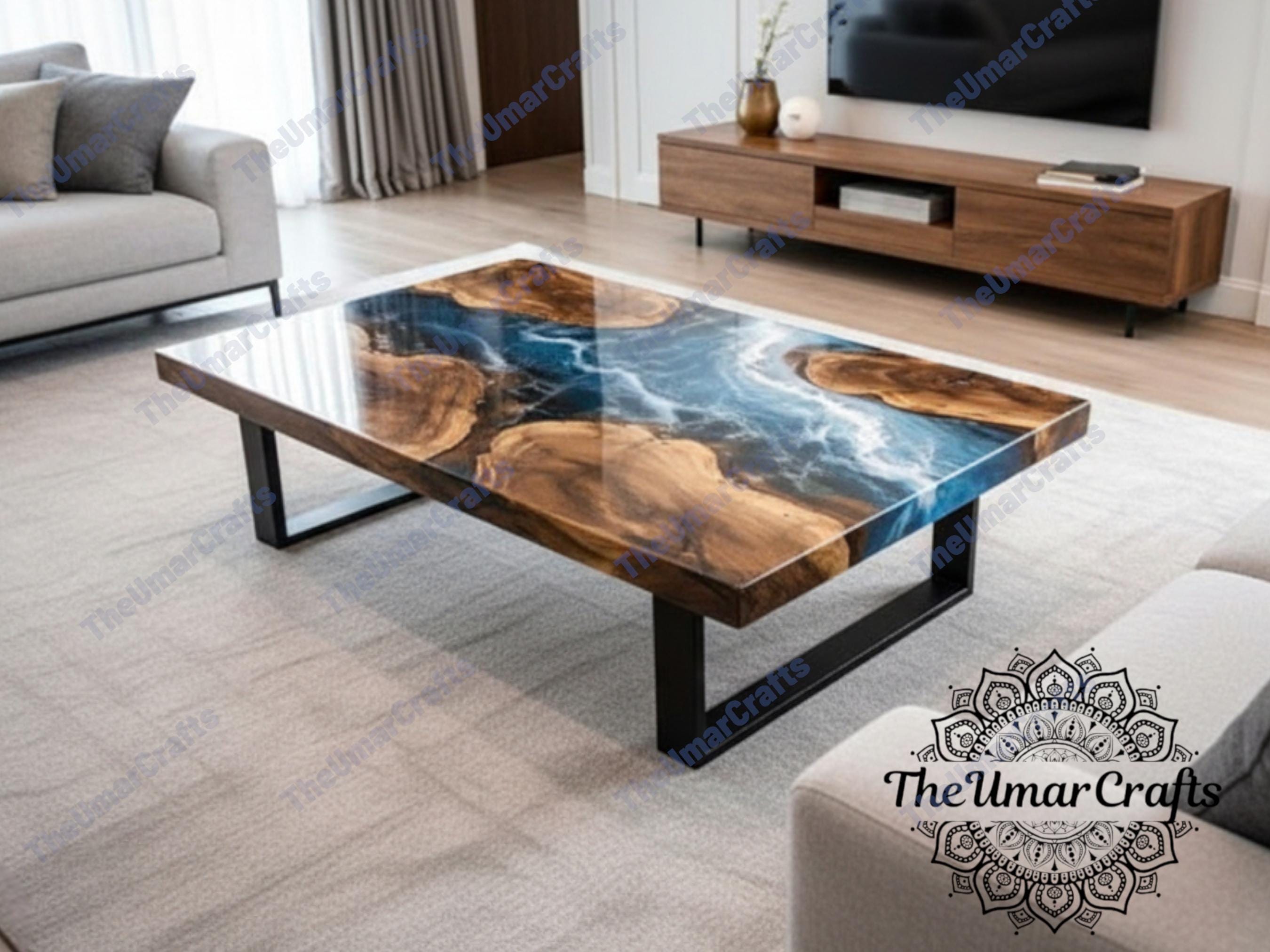 Modern Wood and Clear Resin Living Room Table | Deep Blue Water Eff...