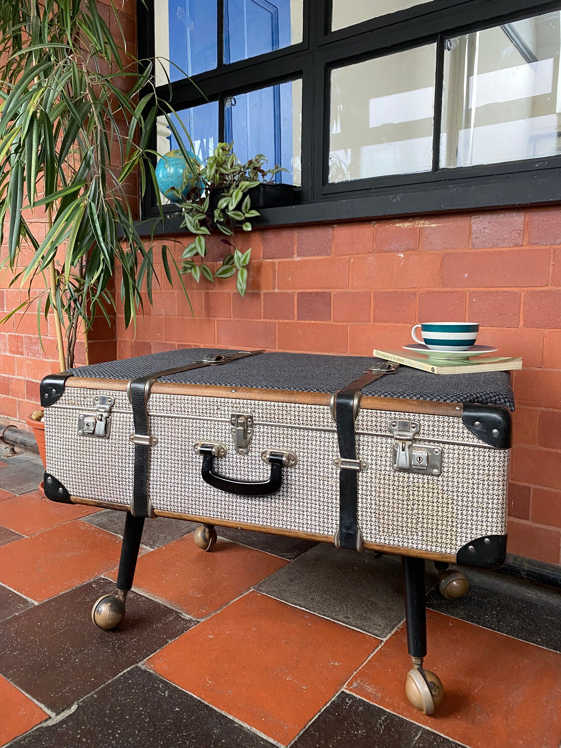 Vintage trunk/suitcase coffee table on casters. Original houndstooth body with lightly padded top up...