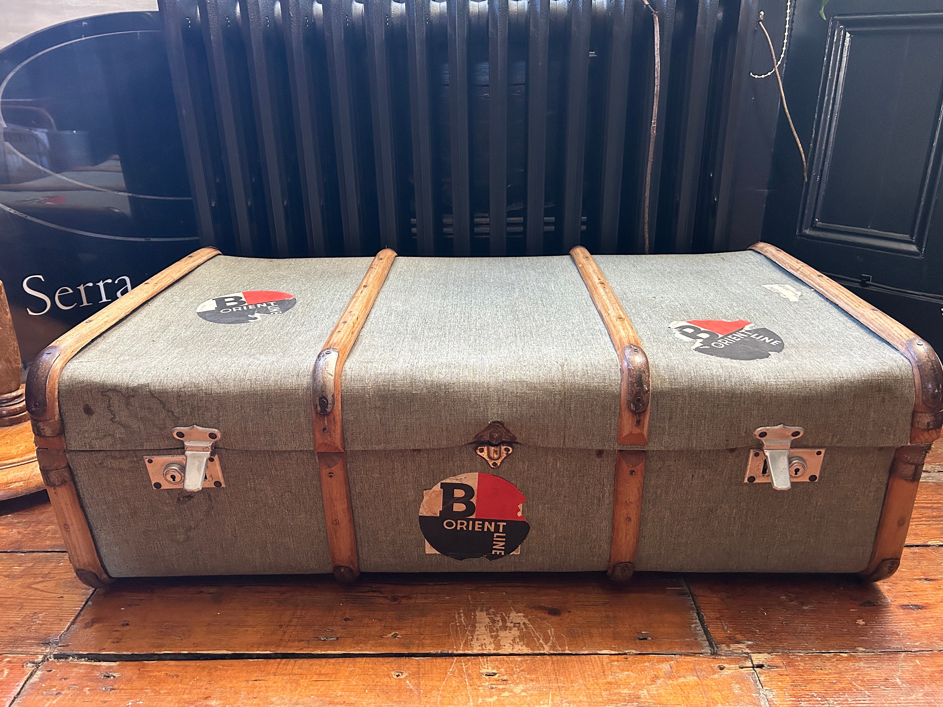 Wonderful steamer trunk from the early 20th century, featuring travel labels from the Orient Steamer...