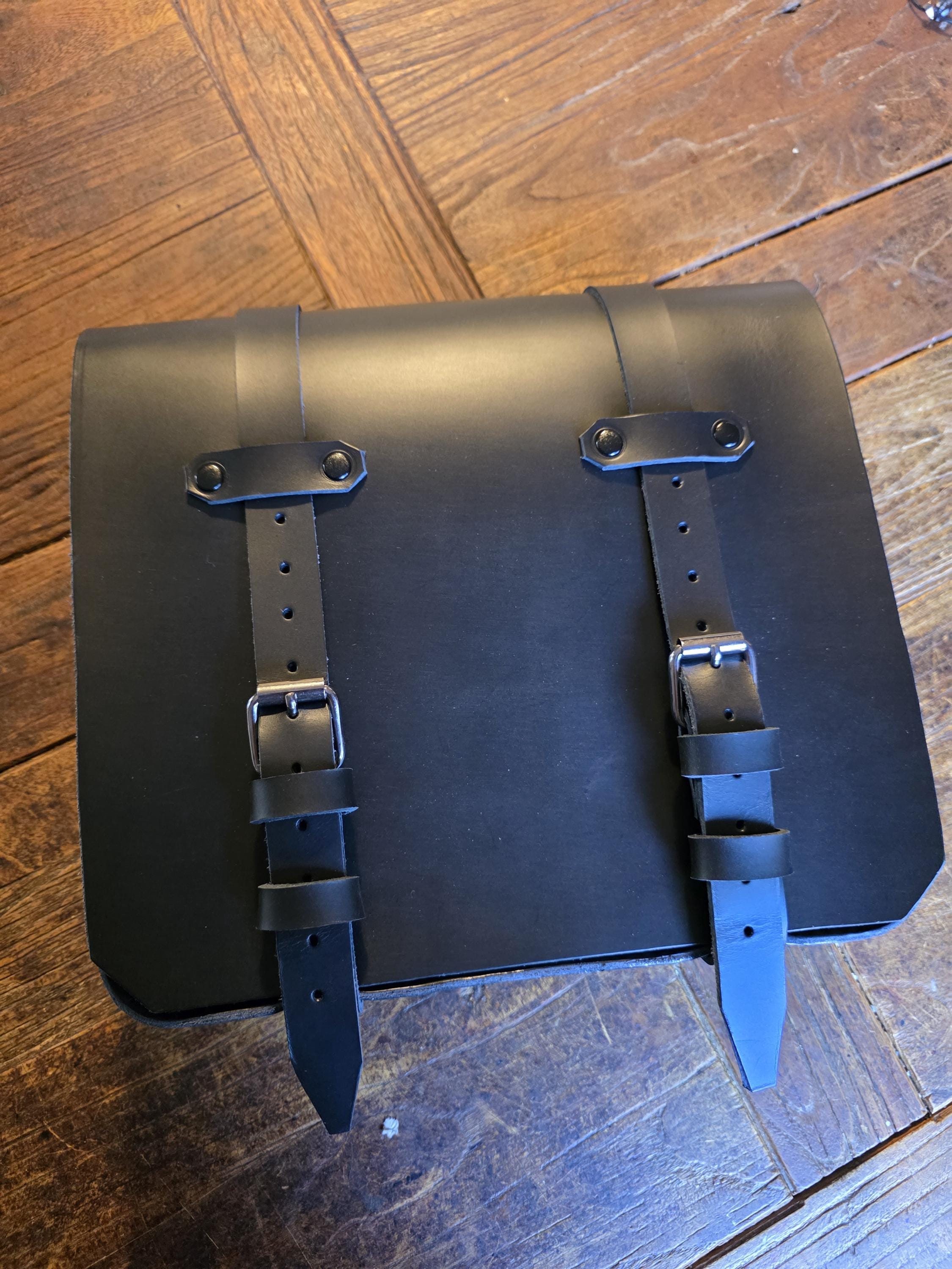 Black leather bag. Final oil treatment. Ideal for cafe racer, scrambler, and custom conversions. Mea...