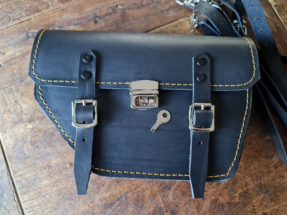 Black leather side bag with gold stitching and key lock. Specifically designed for the Moto Guzzi V7...