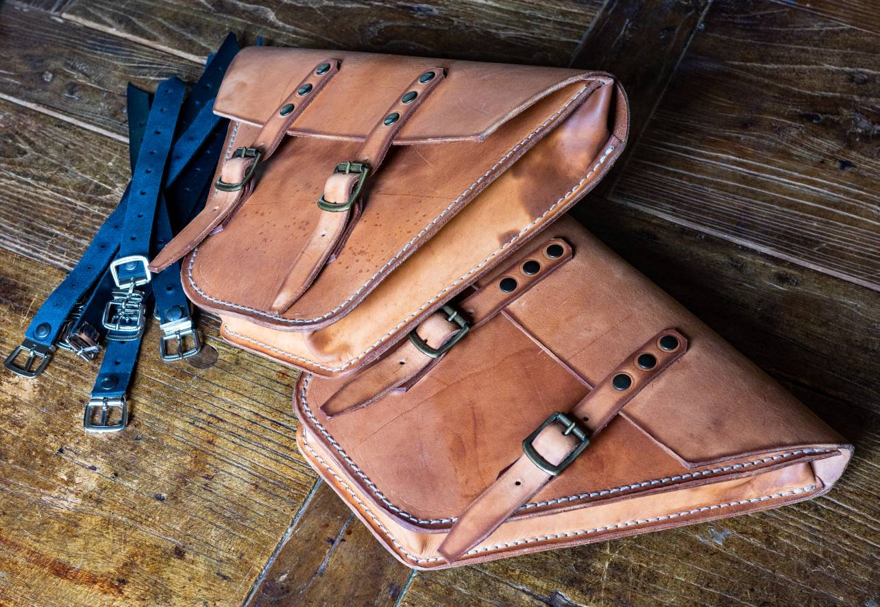 Natural tan leather saddlebags with a patina effect. Specifically designed for the Honda CB 350/500/...