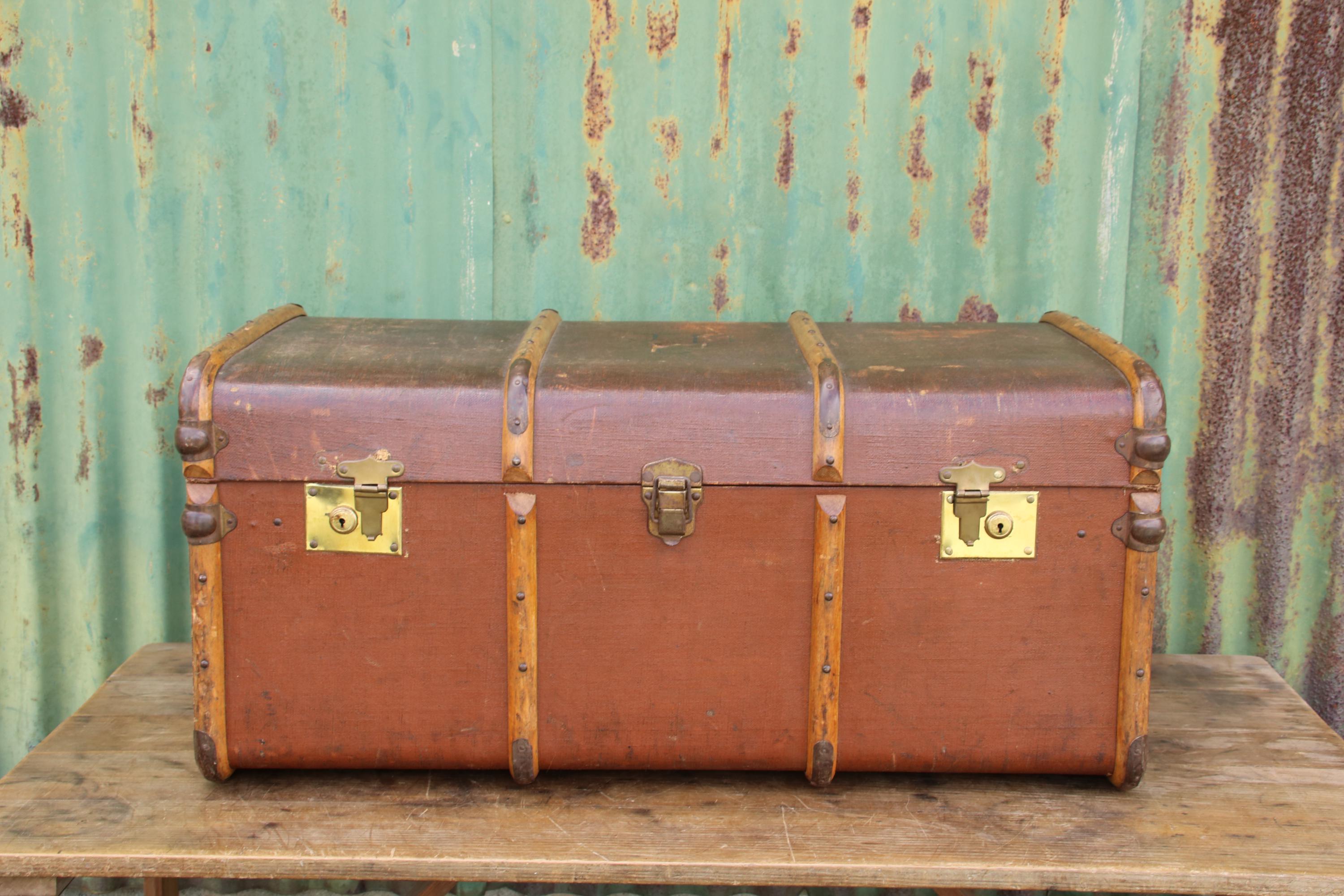 Old Vintage Large Antique Brown Steamer Trunk Case. Coffee Table Lu...