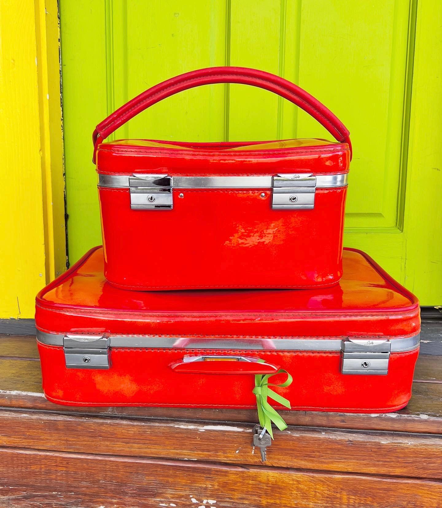 "True Vintage fabulous 1960s bright poppy-orange Skyway luggage set. Vivid red-orange vinyl sma...