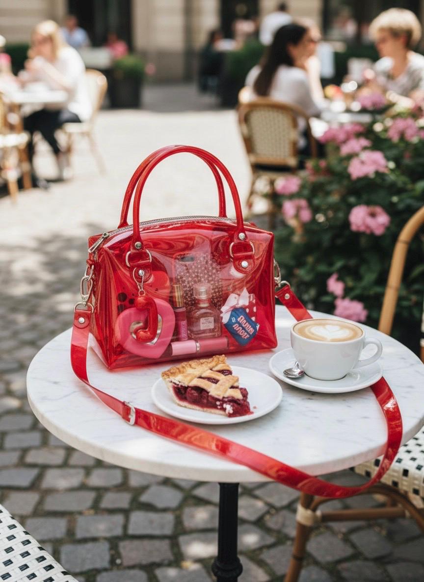 "This boxy red vinyl boxy bag with gold accents is a true fashion statement that will make head...