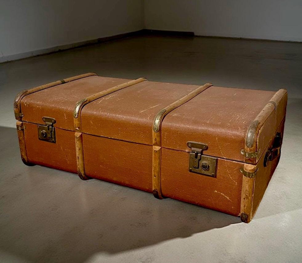 1930s English Overpond Travel Trunk. Antique bentwood banded travel...