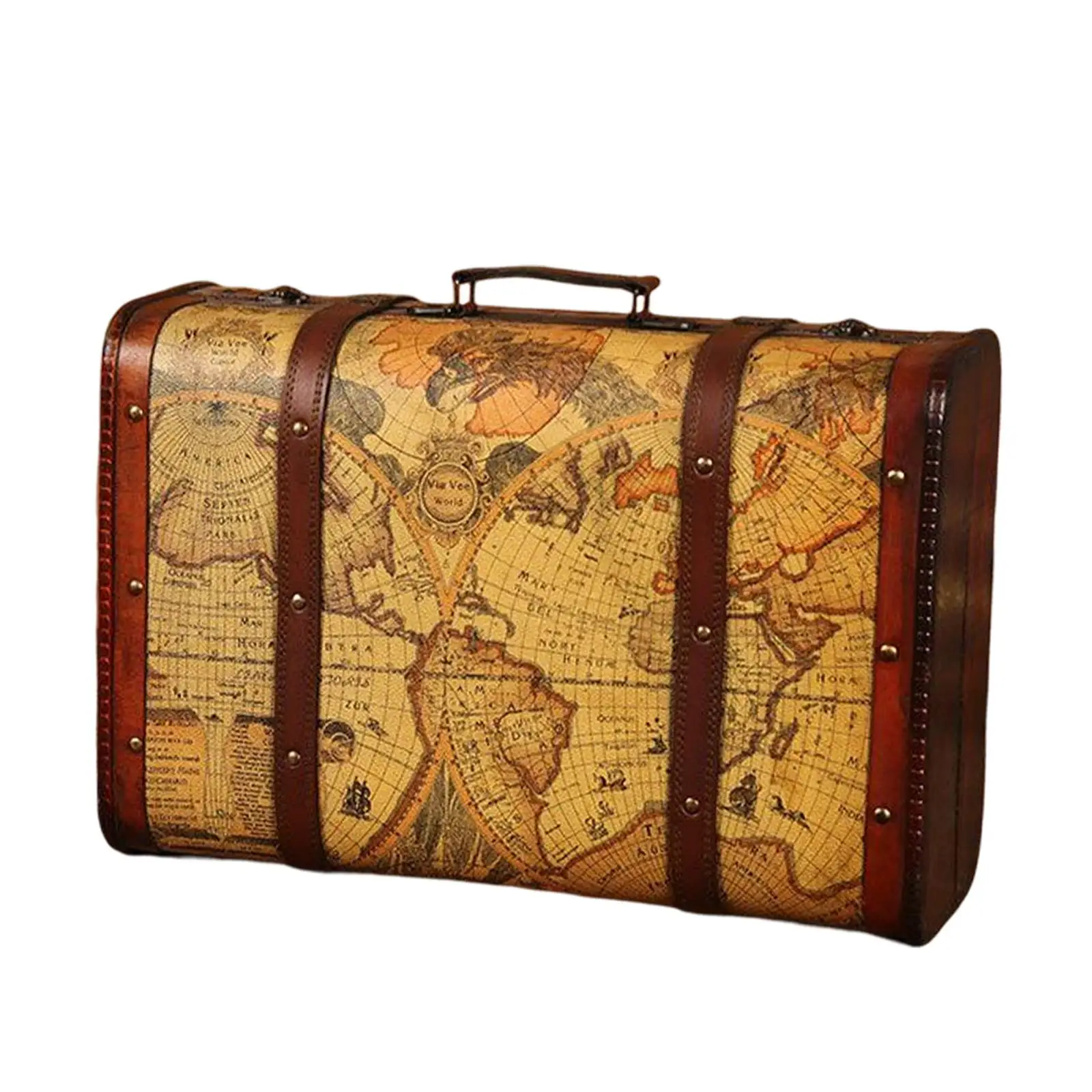 Retro Vintage Suitcase Large Capacity Portable Composite Wood Map Pattern Design Treasure Chest Stor...