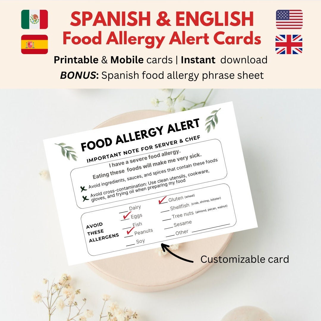 Printable Spanish English Food Allergy Card * Customizable Restaura...