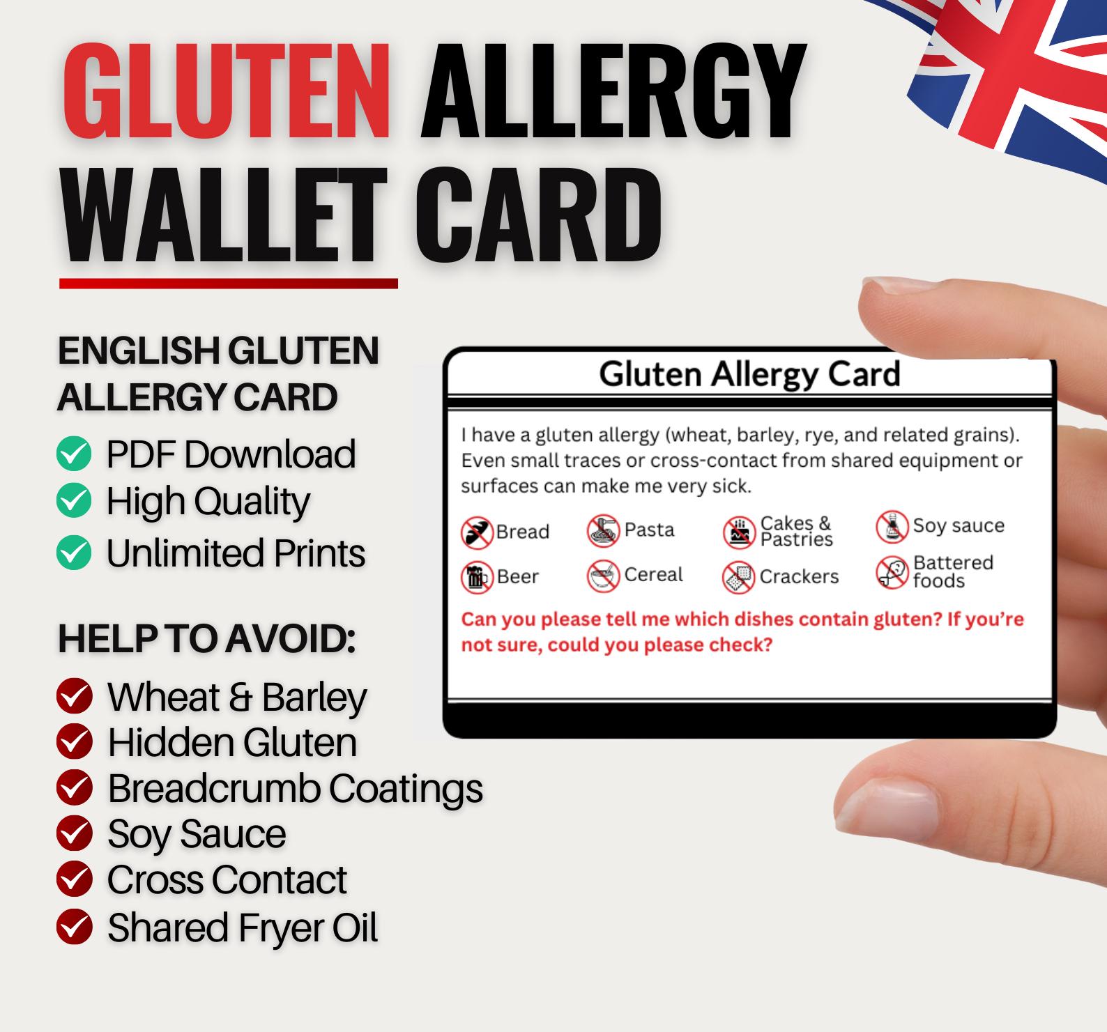Dining out with a gluten allergy or intolerance? This English Gluten Allergy Card is designed to hel...