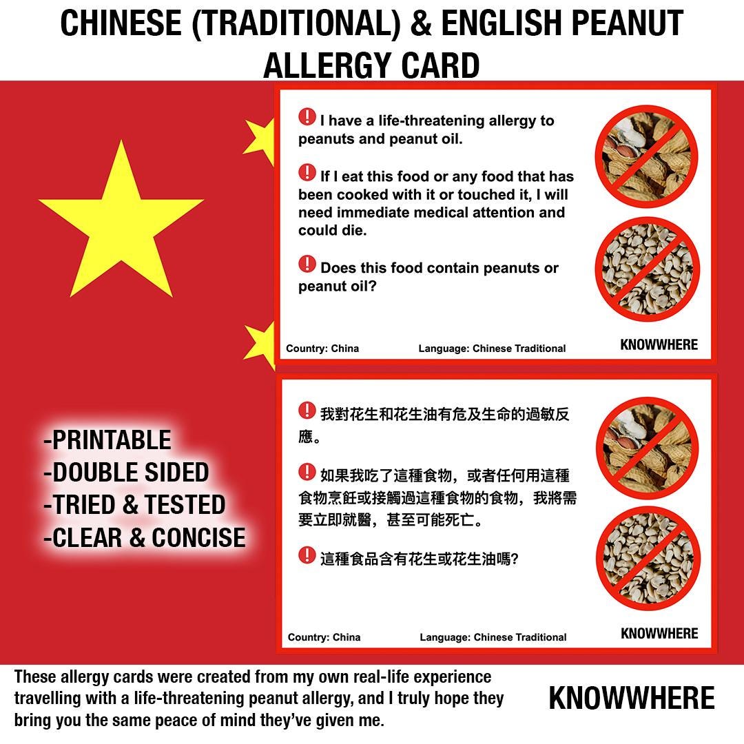 Peanut Allergy Card - Chinese (Traditional) & English (Printable Digital Download) Travelling or...